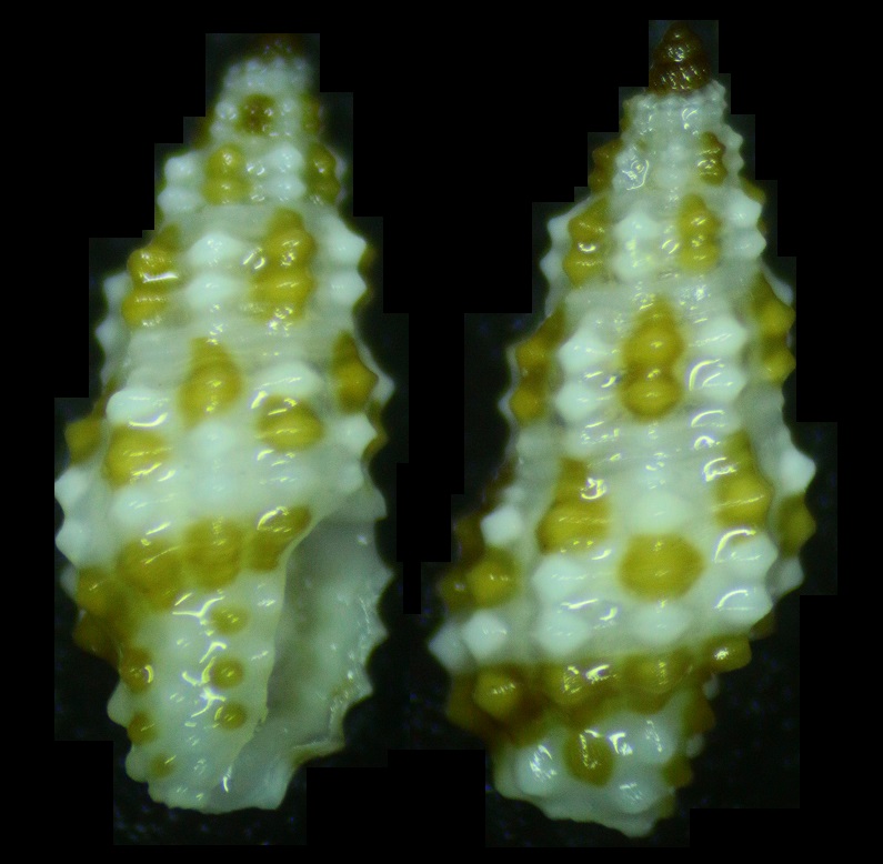 一個有爭議的種類。外型類似以往大家所認為的蕃麥捲管螺Kermia pustulosum(圖二,站長已翻案,確定鑑定有誤)。有的圖鑑將本種鑑定為彩鍊捲管螺Pseudodaphnella rubroguttata(圖三),個人認為有待商榷,因兩者殼型特徵差異非常大,若說是同一物種,真叫人匪夷所思。