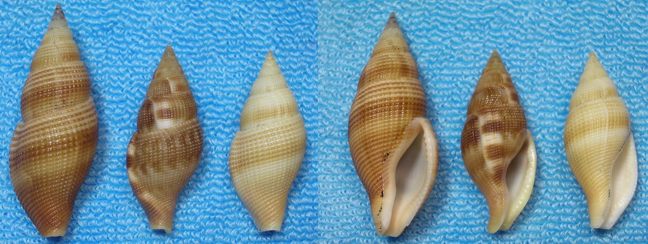有三隻太平洋的布紋螺很像:但是擺在一起就比較好分辨.由左而右是castanea, tenera, springsteeni.分辨重點是越右邊殼體越外凸.