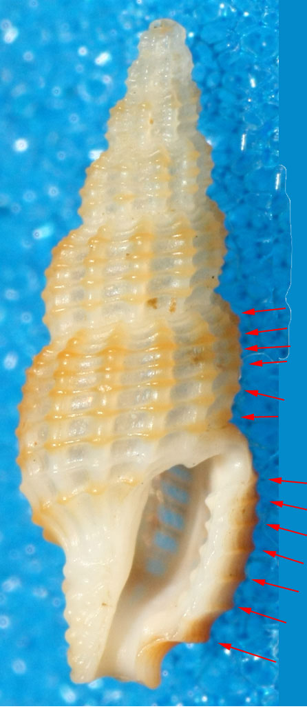 兩者的差別在: infrasulcata最後螺層的外唇有7條橫紋,縱肋較疏,