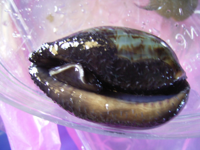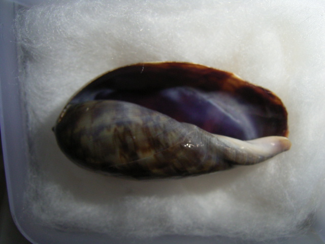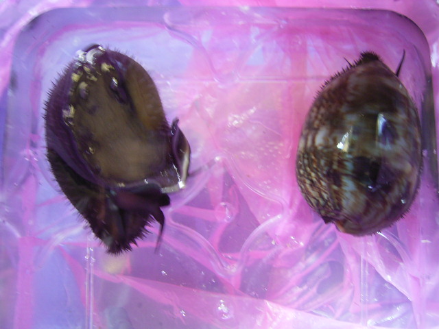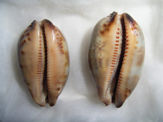 你在7月9日貼上的前五圖〈三個活體及二個照得太胖的〉都是阿拉伯寶螺的亞成貝,7月10日那張圖的第一個也是,第二個是龜甲寶螺的亞成貝,請你仔細對照,在參考tantan1186先生的說明,應該很容易辨認。至於幼貝,請看下圖,圖一是阿拉伯寶螺幼貝,33.6mm;圖二是龜甲寶螺幼貝,74.3mm: