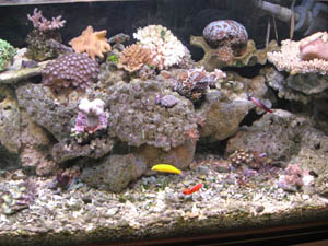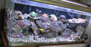 蛋白濾器,圓桶濾器,沉水馬達X2,一個提供水流,一個驅動蛋白濾器,四尺缸(六尺缸太佔位置,已送人),燈管X3;目前有火焰,雷達X2,隆頭魚黃龍,小丑,剃刀X4,海龍,某魚尉科怪物,寄居蟹X3,珊瑚,海葵多枚,白星X3(下午正在啃紐扣...),阿拉伯X2(已隔離,啃肉質軟珊瑚,嗯..比較貴,所以),小楊桃螺