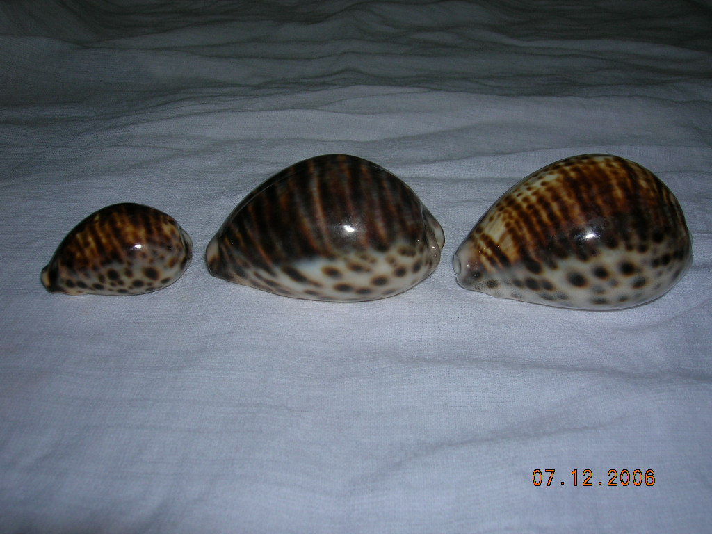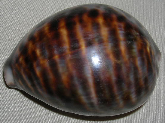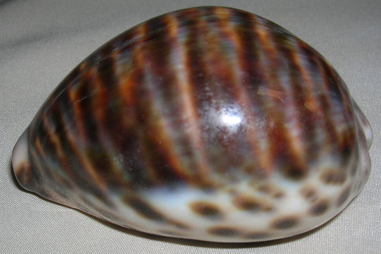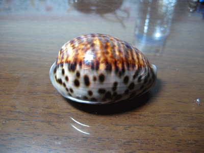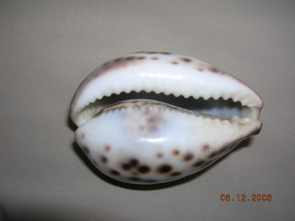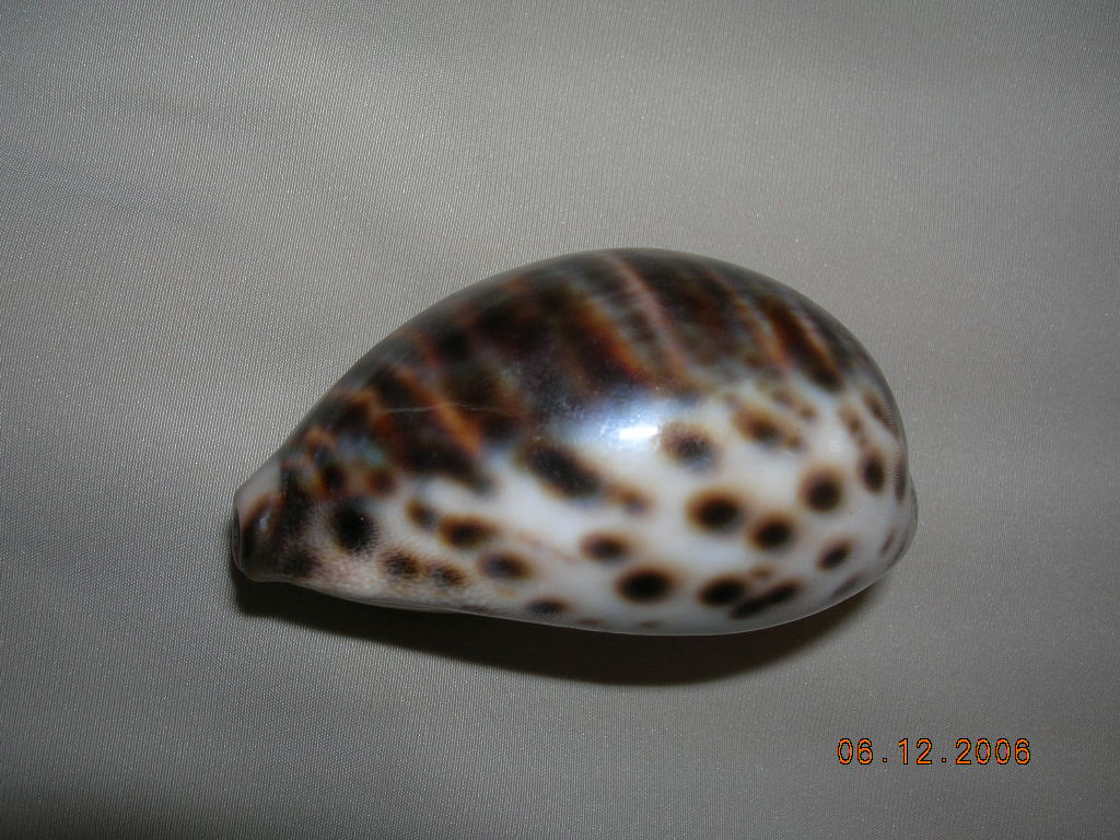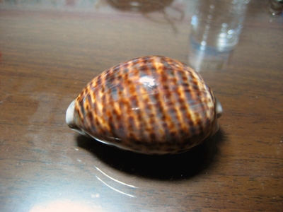 如圖,已完全成貝,58mm。同樣條狀花紋的黑星偶而可見,我猜想會不會是外套膜異常(或久傷)而影響寶螺的背面花紋?