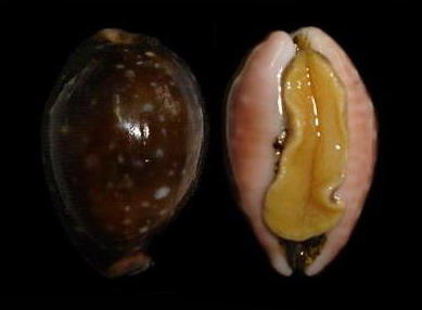 白星寶螺還新鮮時,通常顏色深豔,腹部帶紫色,如圖一〈35.6mm〉。