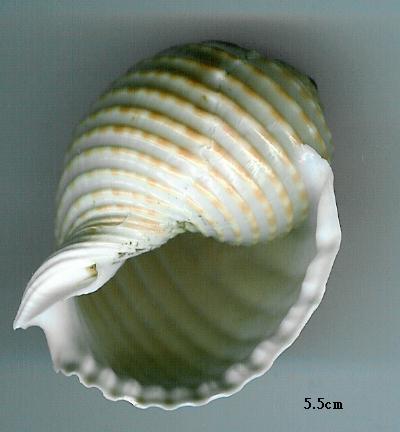 厚殼鶉螺        ---體型較小.殼表顏色偏暗.殼口內褐色.外唇邊緣加厚並有強烈齒狀突起.兩螺肋間的中肋常出現斑點消失情形