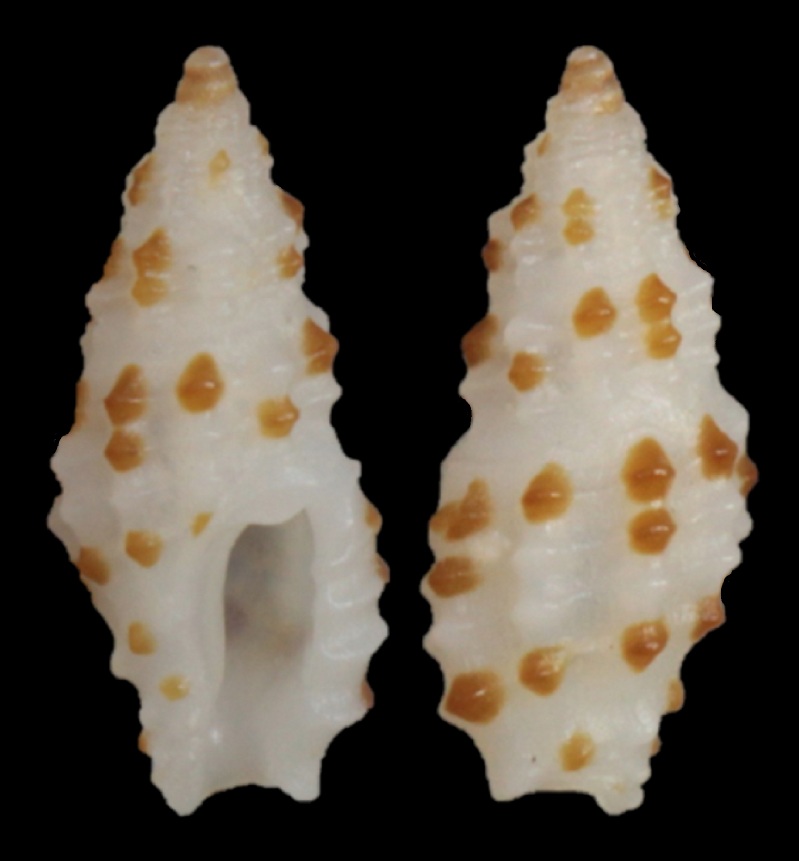 一個有爭議的種類。外型類似以往大家所認為的蕃麥捲管螺Kermia pustulosum(圖二,站長已翻案,確定鑑定有誤)。有的圖鑑將本種鑑定為彩鍊捲管螺Pseudodaphnella rubroguttata(圖三),個人認為有待商榷,因兩者殼型特徵差異非常大,若說是同一物種,真叫人匪夷所思。