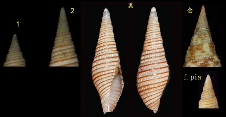 金彈簧筆螺,這隻殼,去過蝦場的貝友,手上都一堆.它是個花色變異非常大的殼,合成Hardy的圖片來說明:第1,2對是金彈簧,第3對是深海型的金彈簧(不是退色的苦樂巴,已更名為Domiporta polycincta ( H.Turner, 2007 )),第4組是Ziba verrucosa ,第5隻殼是稀有的Ziba hrdlickai, (Salisbury, R., 1994).可見他多麼會搞混.