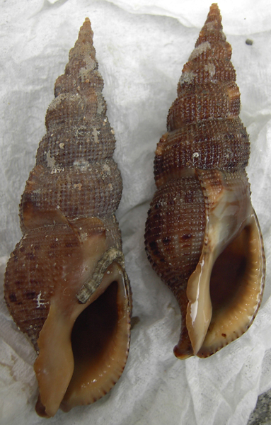 二號殼有突出的縱肋與縫合下肩瘤,唯一有這個特徵的Colubraria屬就只有Colubraria antiquate (Hinds, R.B. in Reeve, L.A., 1844),他的殼口medial columella反折成環,也是獨有特徵,當我從一堆黑汚汚挑出時,憋住了呼吸,三年內找遍各網站都摃龜.官方的記載,上次台灣antiquate採集的紀錄是黑田德米先生.如果前輩貝友尚有採集的標本,也請您貼出分享.(後記:這隻殼來自澎湖海域,只追查到這麼多)