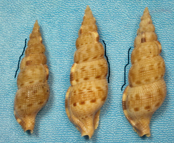 有三隻太平洋的布紋螺很像:但是擺在一起就比較好分辨.由左而右是castanea, tenera, springsteeni.分辨重點是越右邊殼體越外凸.