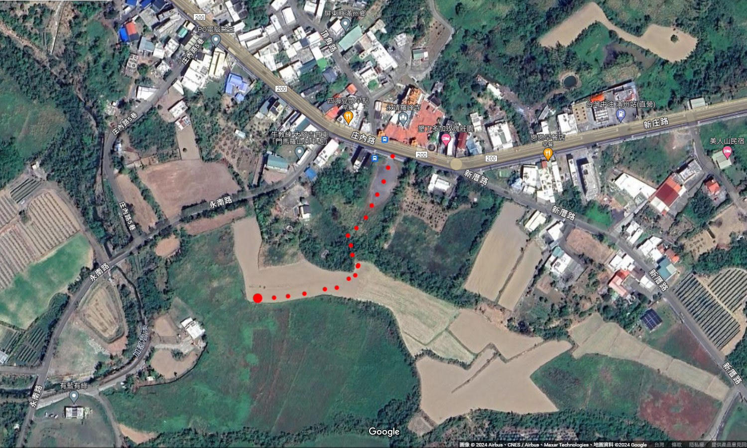 換算成現在約是在頂角路與庄內路的交叉口,但頂角路與庄內路有兩個交會點(下圖2紅點),
