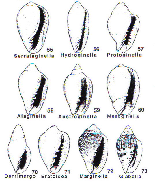 真是究極天人的收藏:老實說,arnold_lin,您的綠島榖米螺,已經顛覆,而超越Indo-West pacific faunal zone. 附上Coovert & Coovert1995發表的 Revision of the Supraspecific Classification of Marginelliform Gastropods的部分圖說: