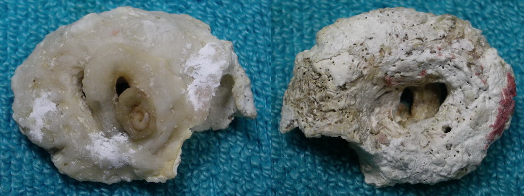 再拿另一隻不知名蛇螺來討論殼胚,殼長32mm,來源也是澎湖山水.(關於這隻殼的鑑定,細捲成一坨xx,像一坨蟲,憑感覺可能是蠕形蛇螺Spiroglyphus spiruliformis,無資料可查,如果先進知道正確學名,懇請賜教)