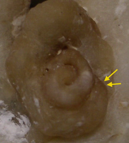 早期殼層放大圖,在1又1/2殼胚後,(箭頭處)螺體開始變大,形成第一體殼層.到此,蛇螺的特徵大致都了解了.