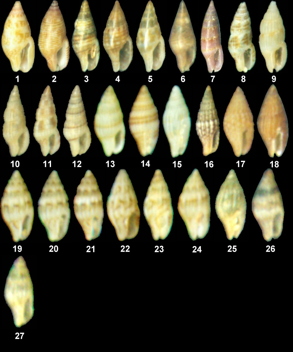 1.Metanachis jaspidea (Sowerby,1844) 恆春半島產 10mm 2. 恆春半島產 12mm 3.Metanachis marquesa (Gaskoin,1852) 菲律賓產 8mm 4. 菲律賓產 8mm 5.Pseudamycla formosa (Gaskoin,1852) 菲律賓產 7mm 6.Mokumea divaricata (Pilsbry,1904) 菲律賓產 5mm 7.Aesopus spiculus (Duclos,1840 in 1835-40) 菲律賓產 16mm 8.Zafrona lifuana (Hervier,1899) 恆春半島產 9mm 9.Zafrona neburosa (Gould,1860) 恆春半島產 8mm 10.Zafrona isomella (Duclos,1840 in 1835-40) 恆春半島產 5mm 11. 菲律賓產 6mm 12. 菲律賓產 6mm 13.Zafra minuscula (Gould,1860) 恆春半島產 4mm 14. 恆春半島產 3mm 15.Zafra peasei (von Martens & Langkavel,1871) 恆春半島產 4mm 16. 恆春半島產 6mm 17.Zafra saviniae (Viader,1951) 恆春半島產 3mm 18.Zafra pumila (Dunker,1860) 恆春半島產 4mm 19.Zafra troglodytes (Souverbie,1866) 恆春半島產 3mm 20.Zafra hervieri (Pace,1902) 恆春半島產 3.5mm 21. 菲律賓產 3mm 22.Zafra sinensis (Sowerby,1894) 恆春半島產 3mm 23.Zafra hahajimana (Pilsbry,1904) 恆春半島產 3mm 24. 恆春半島產 3mm 25.Zafra succinea (Hervier,1899) 菲律賓產 3mm 26. 菲律賓產 3mm 27. 菲律賓產 3mm
