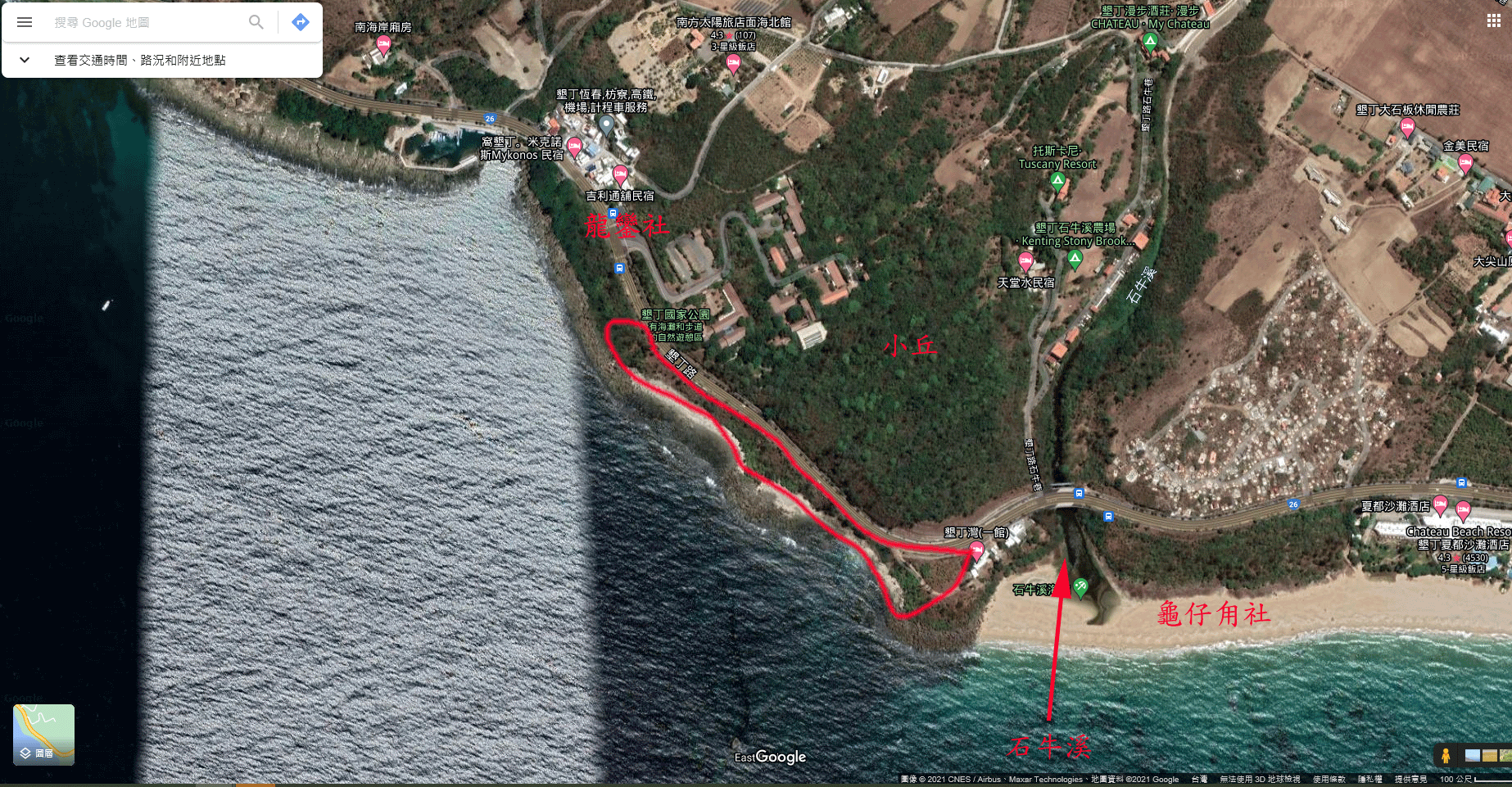 這個龍鑾社的部落就在小丘之西, 經查證google地圖, 應該就在現今潭仔灣漁港旁的村落: 潭灣仔的北方200-400公尺處。