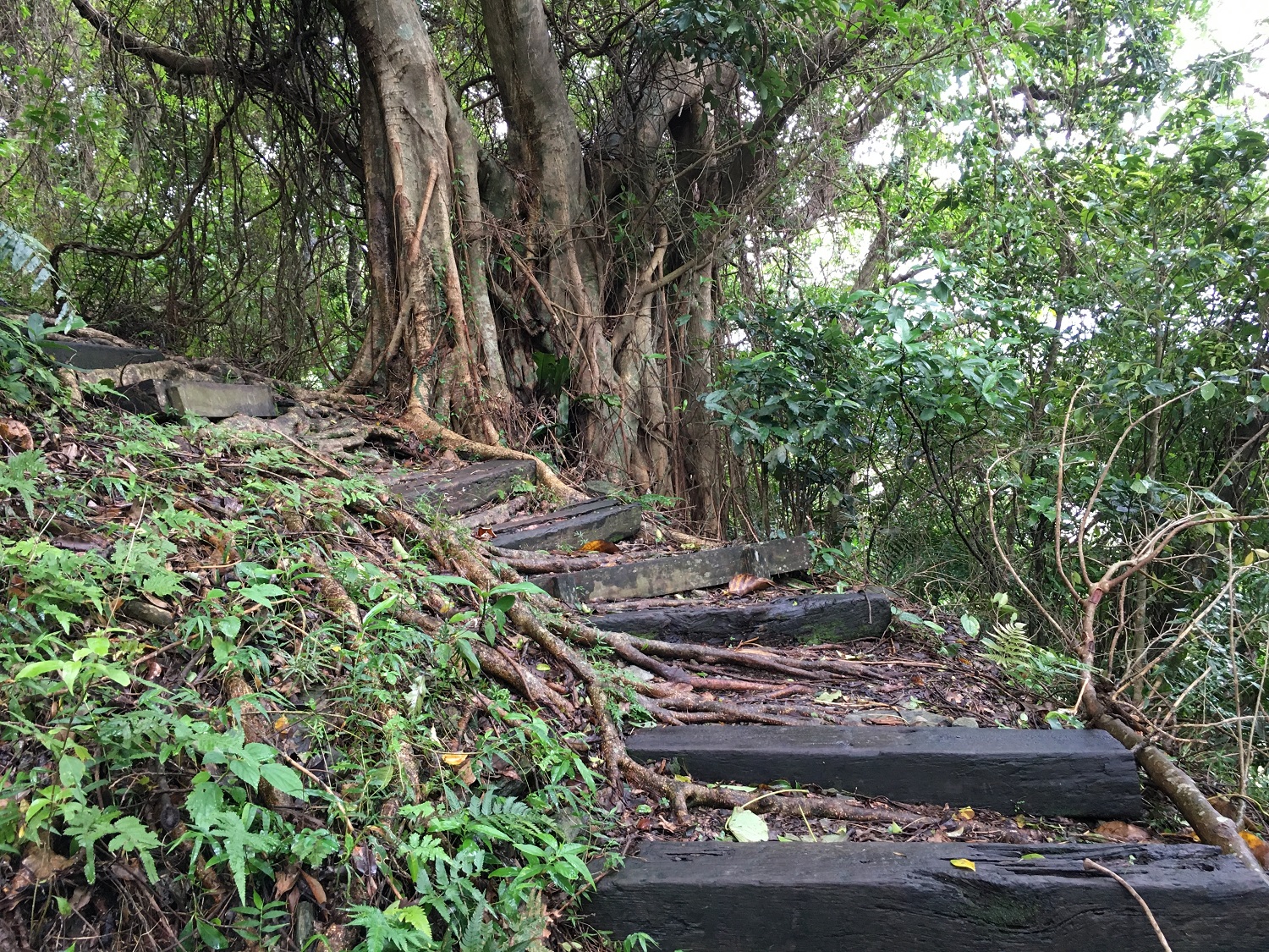 朝陽國家步道是以木棧鋪築而上, 2003年完工至今已19年, 進入步道沒多久就遇到一顆大榕樹, 其樹根盤虬曲張, 與木棧道已混為一體。