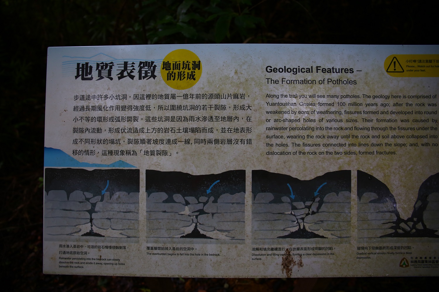 不過這裡地質不穩定更麻煩, 有些步道已陷落成坑洞, 要架木橋才能走過去, 而有些沒有公德心的遊客居然將垃圾丟入坑內