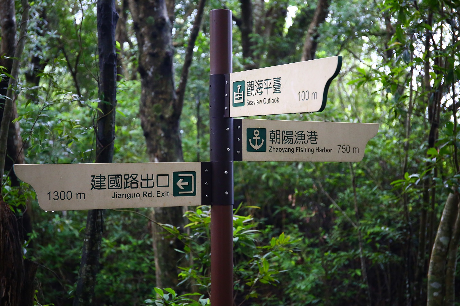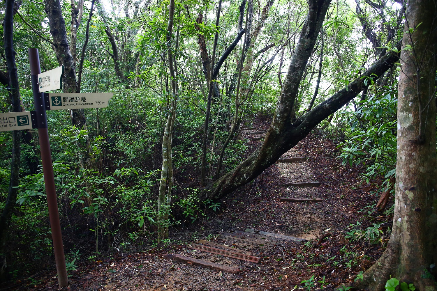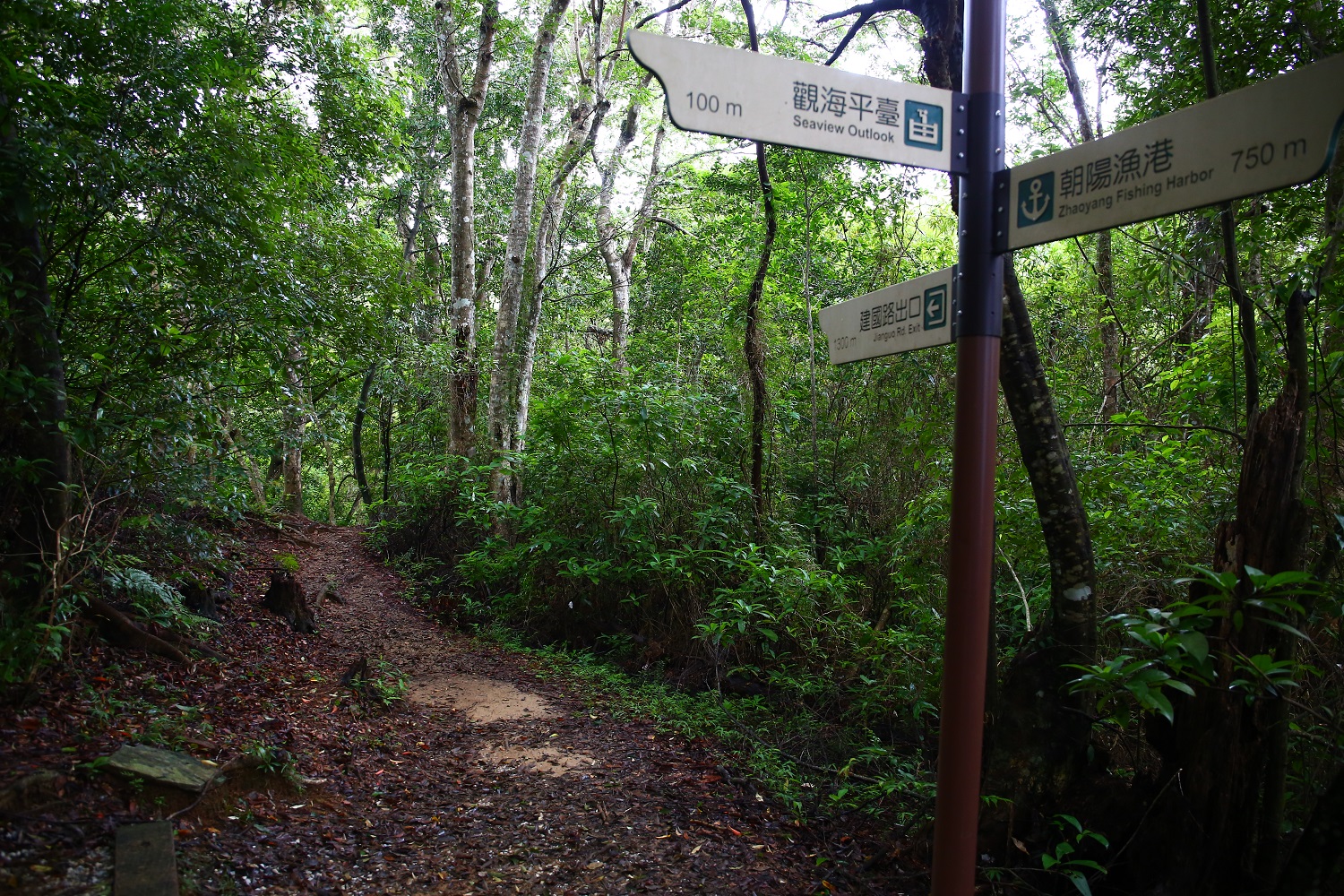 經過750公尺, 來到三叉路口, 一路往山頂的觀海平台, 另一路往建國路出口、三角點及朝陽社區出口。