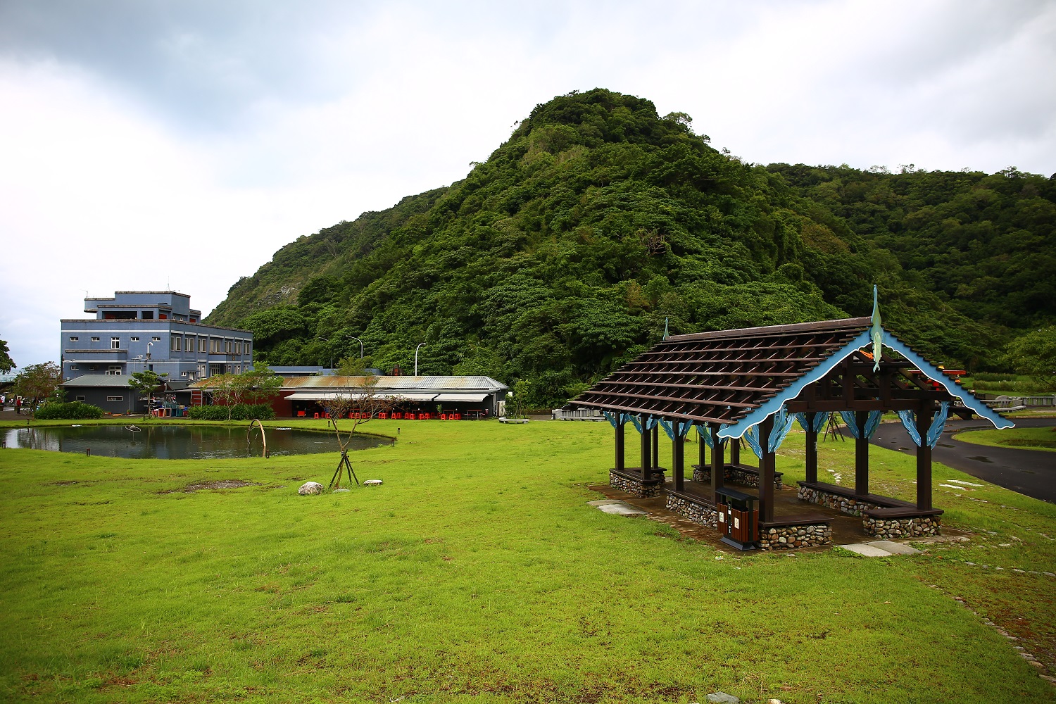 山下的公園有水池, 有涼亭, 水池旁有翠鳥。