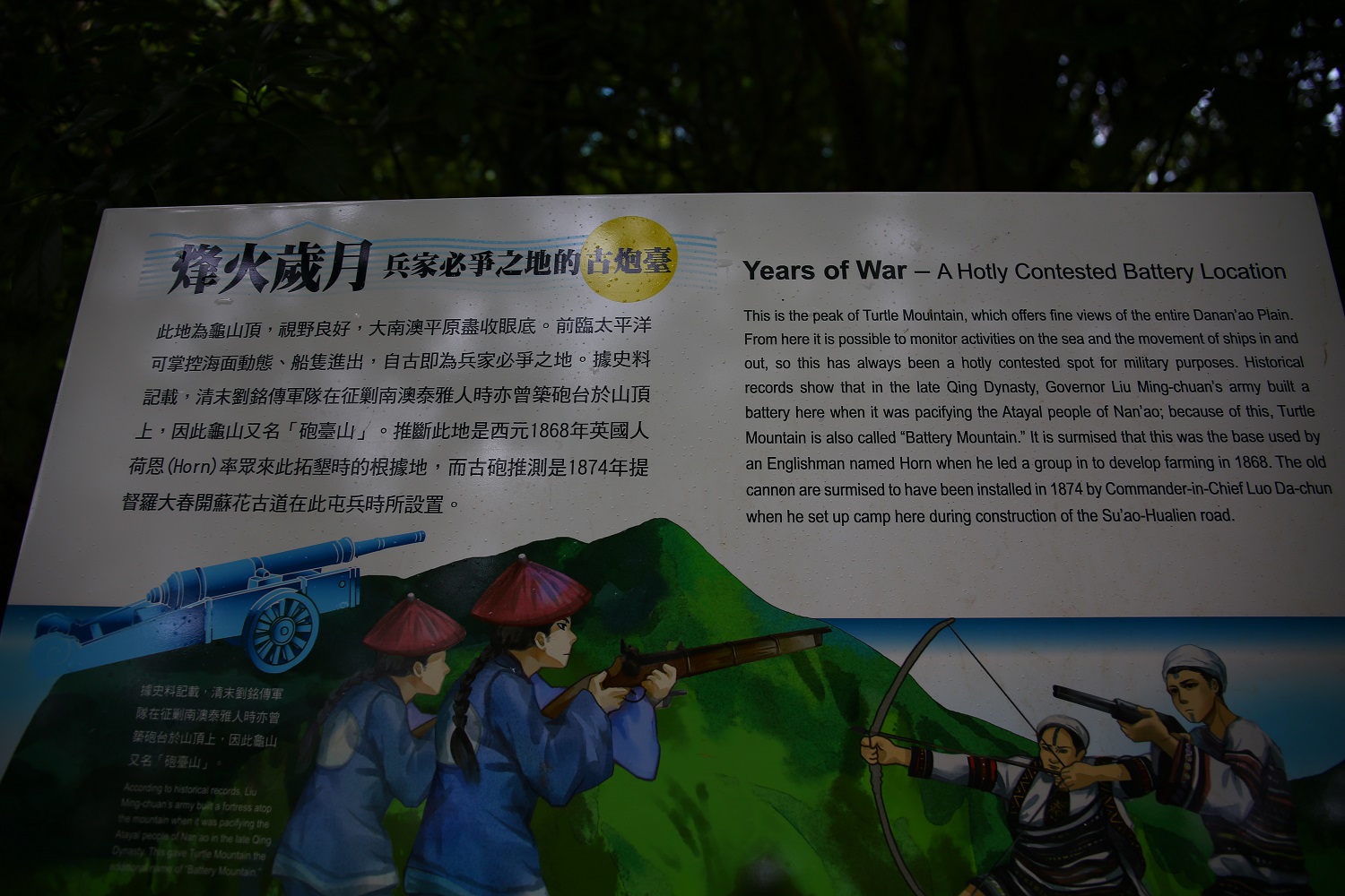 再往觀海平台方向走約50公尺, 看到一個「烽火歲月」解說牌, 上面記載,...推斷此地是西元1868年英國人荷恩(Horn)率眾在此拓墾時的根據地,...。