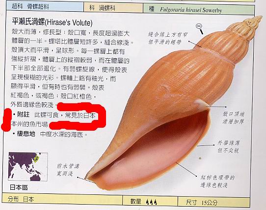 今天翻貓頭鷹的[貝類圖鑑]看到平賴氏渦螺裡有一段說明,我用紅色作標記,李昭慶曾拿一粒殼口嚴重破損,說是稀有貝要賣我1300元,當初由於破損而沒買.後來我在有線電視日本節目中看到它出現在日本漁市場而很震驚,今天我在貓頭鷹的[貝類圖鑑]看到證據,特別show出來,它的數量標示為common種(右下角),讓新貝友了解,像李昭慶這麼資深的貝殼人都會把外國common貝拿到台灣當rare貝高價賣,所以新貝友要買高價殼時要下功夫,貝商講的話不見得正確.