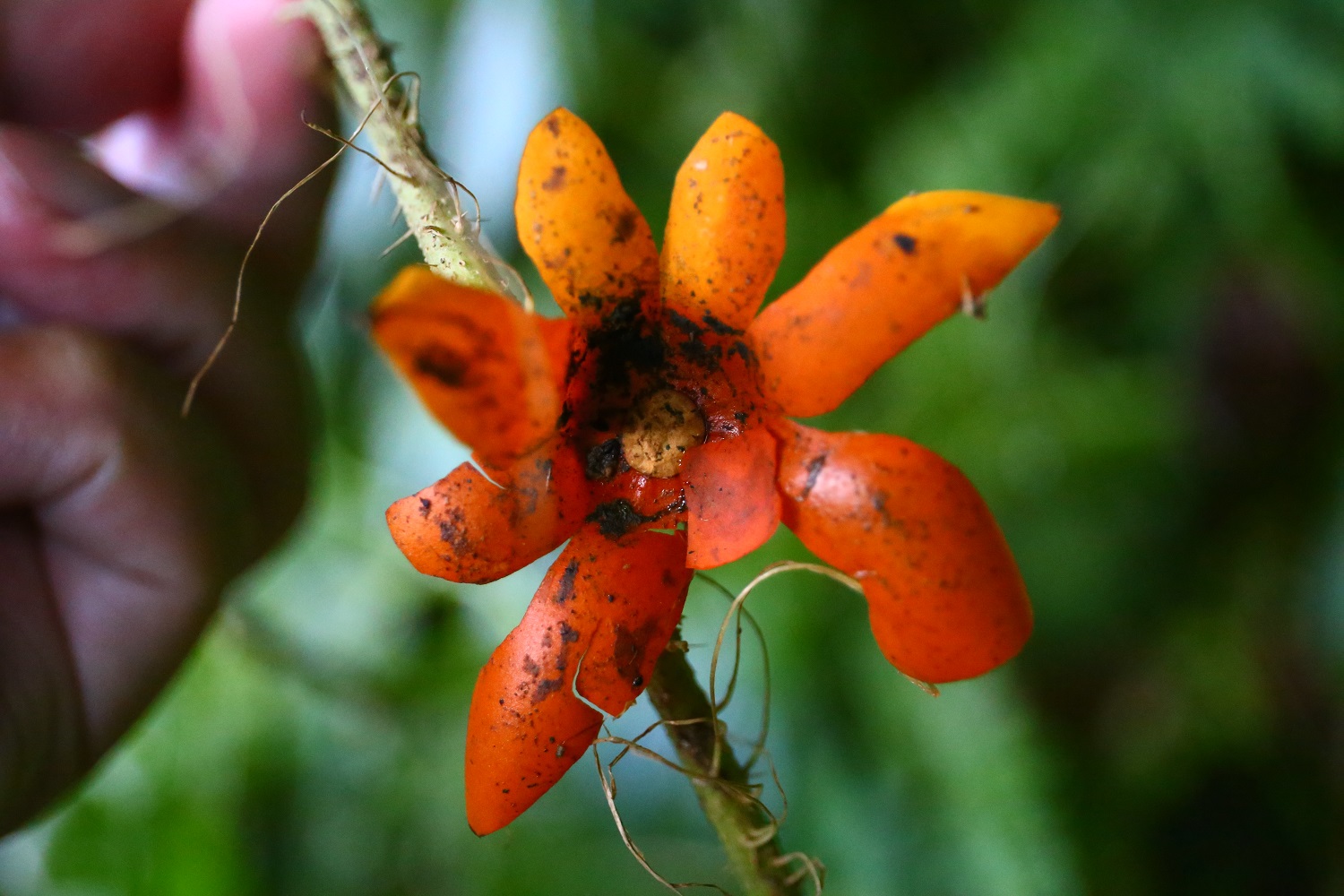 果實成熟後會爆開, 僅留下果皮在枝上, 仿佛開了一朵橘色的花, 其實它的花是白色的