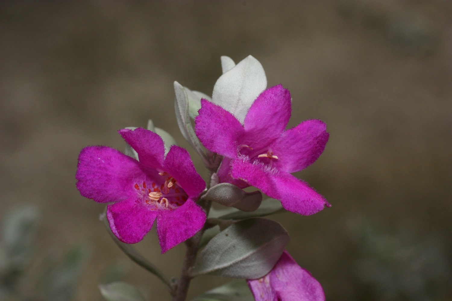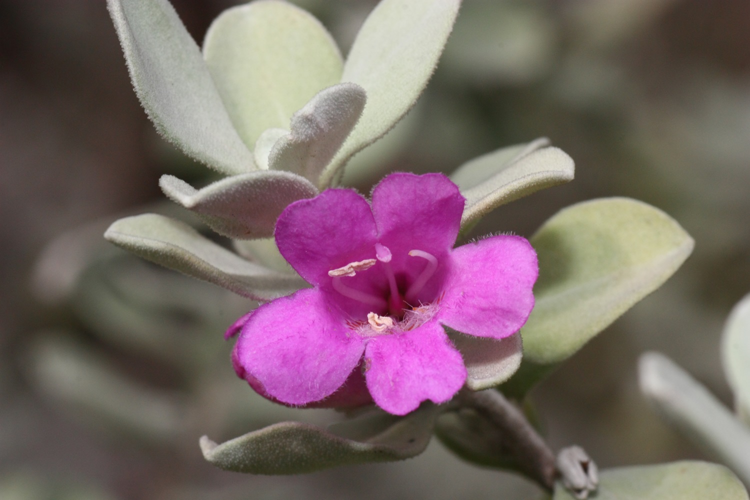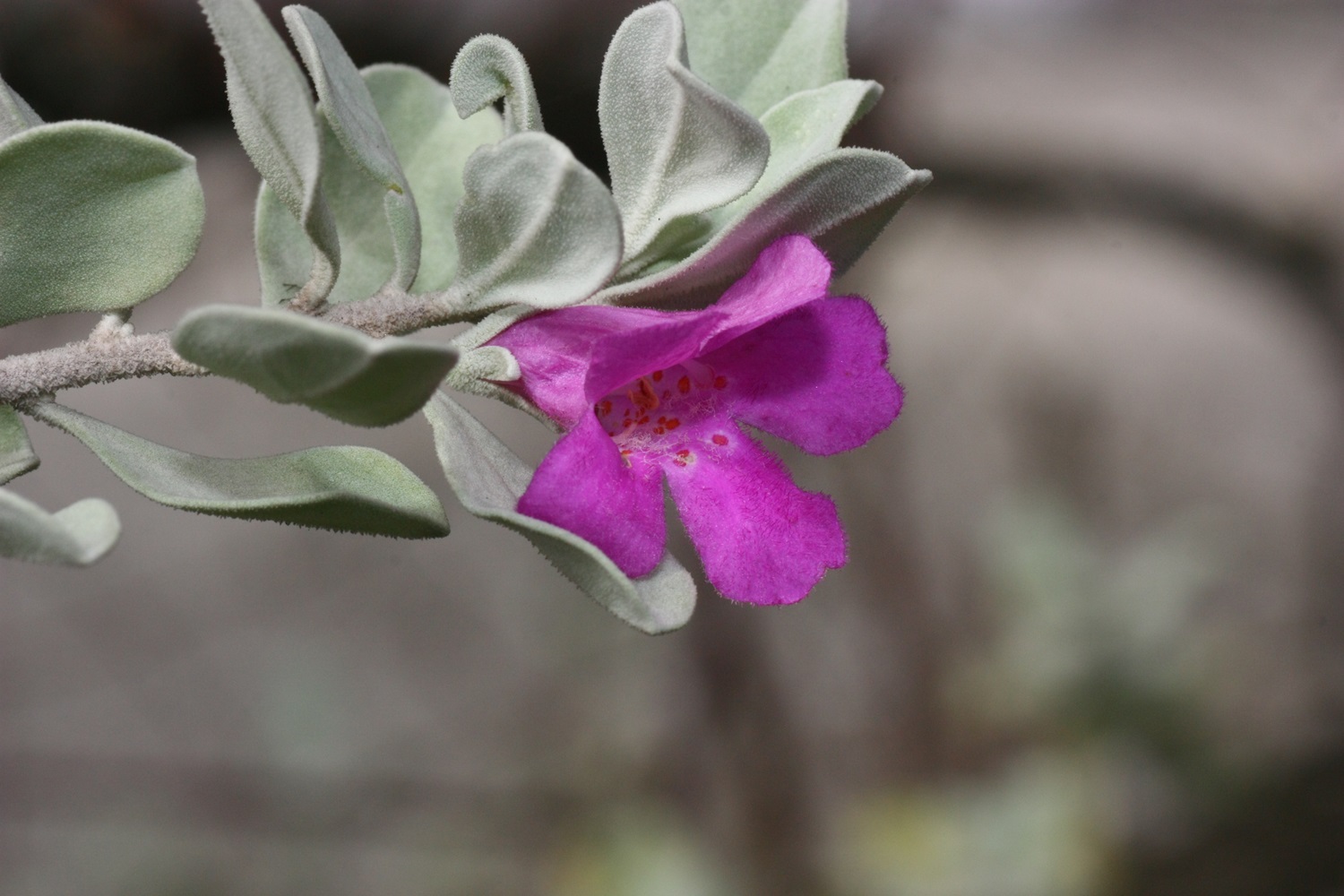 紅花玉芙蓉, 玄參科(Scrophulariaceae), 紅花玉芙蓉(Leucophyllum), 學名: Leucophyllum frutescens, 英文名稱:Texas Ranger, 又稱為:玉芙蓉、紅花芙蓉、德州鼠尾草、銀葉、紫花鼠尾草, 原產地: 美國德州、墨西哥。