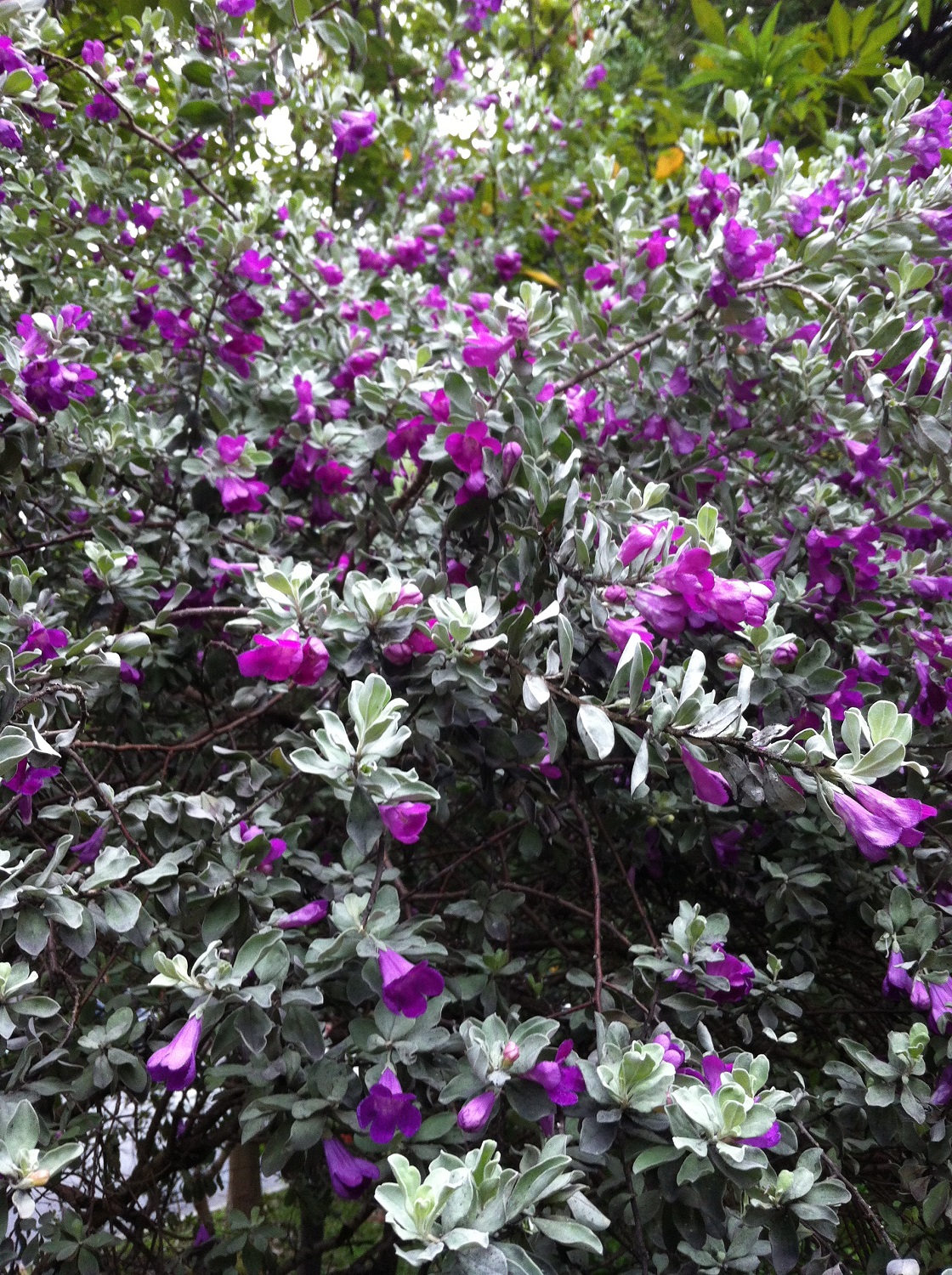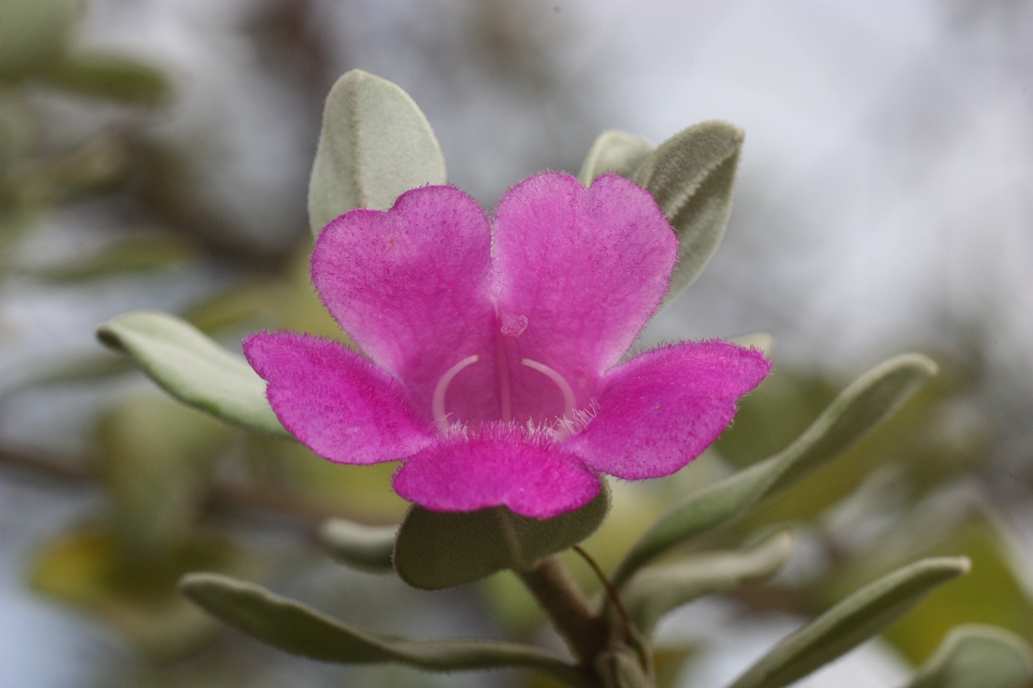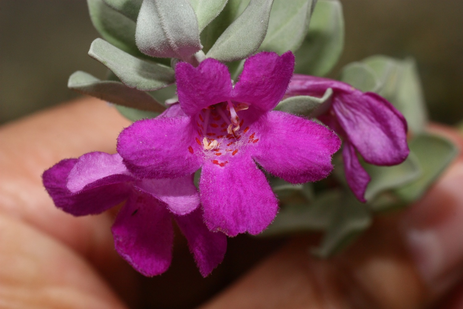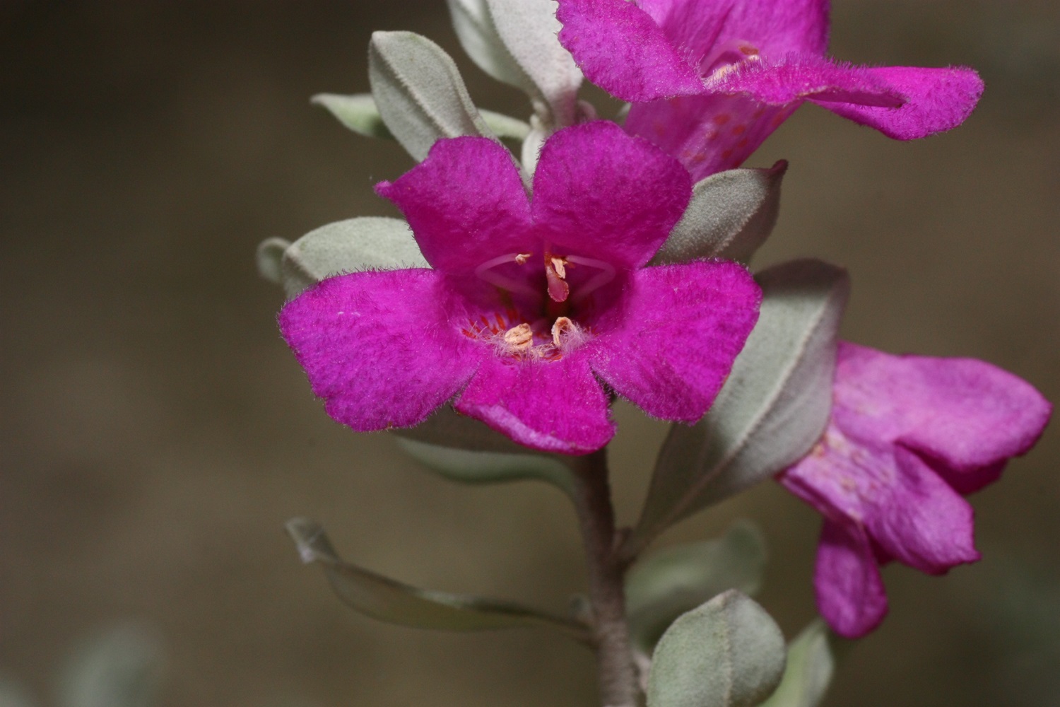 紅花玉芙蓉, 玄參科(Scrophulariaceae), 紅花玉芙蓉(Leucophyllum), 學名: Leucophyllum frutescens, 英文名稱:Texas Ranger, 又稱為:玉芙蓉、紅花芙蓉、德州鼠尾草、銀葉、紫花鼠尾草, 原產地: 美國德州、墨西哥。