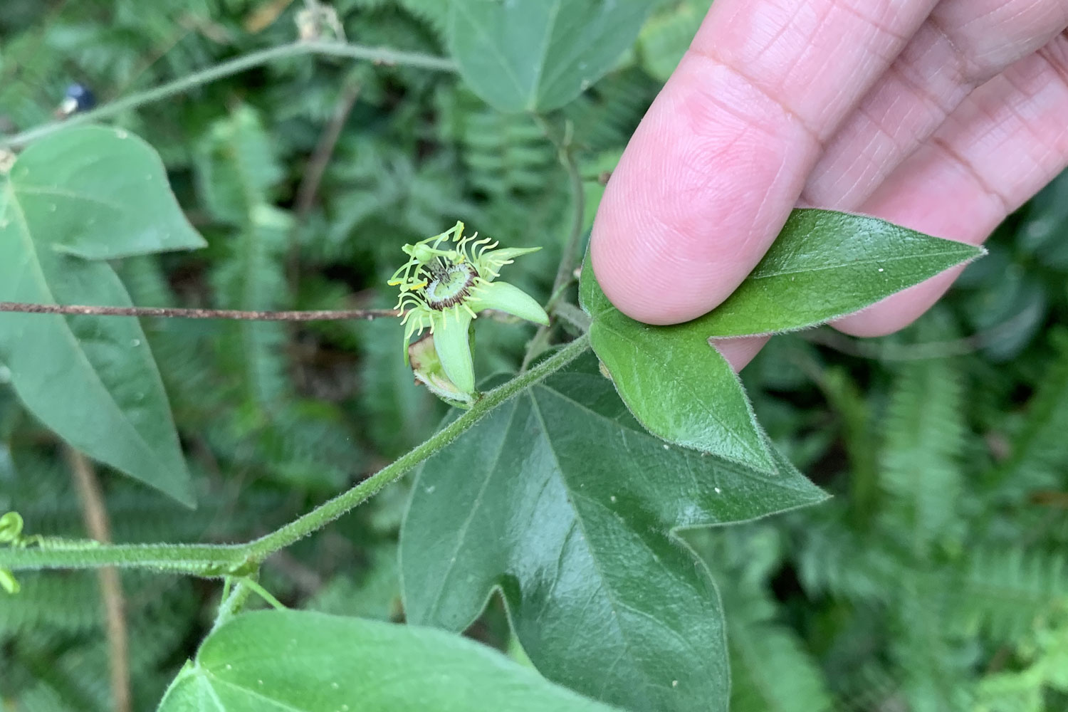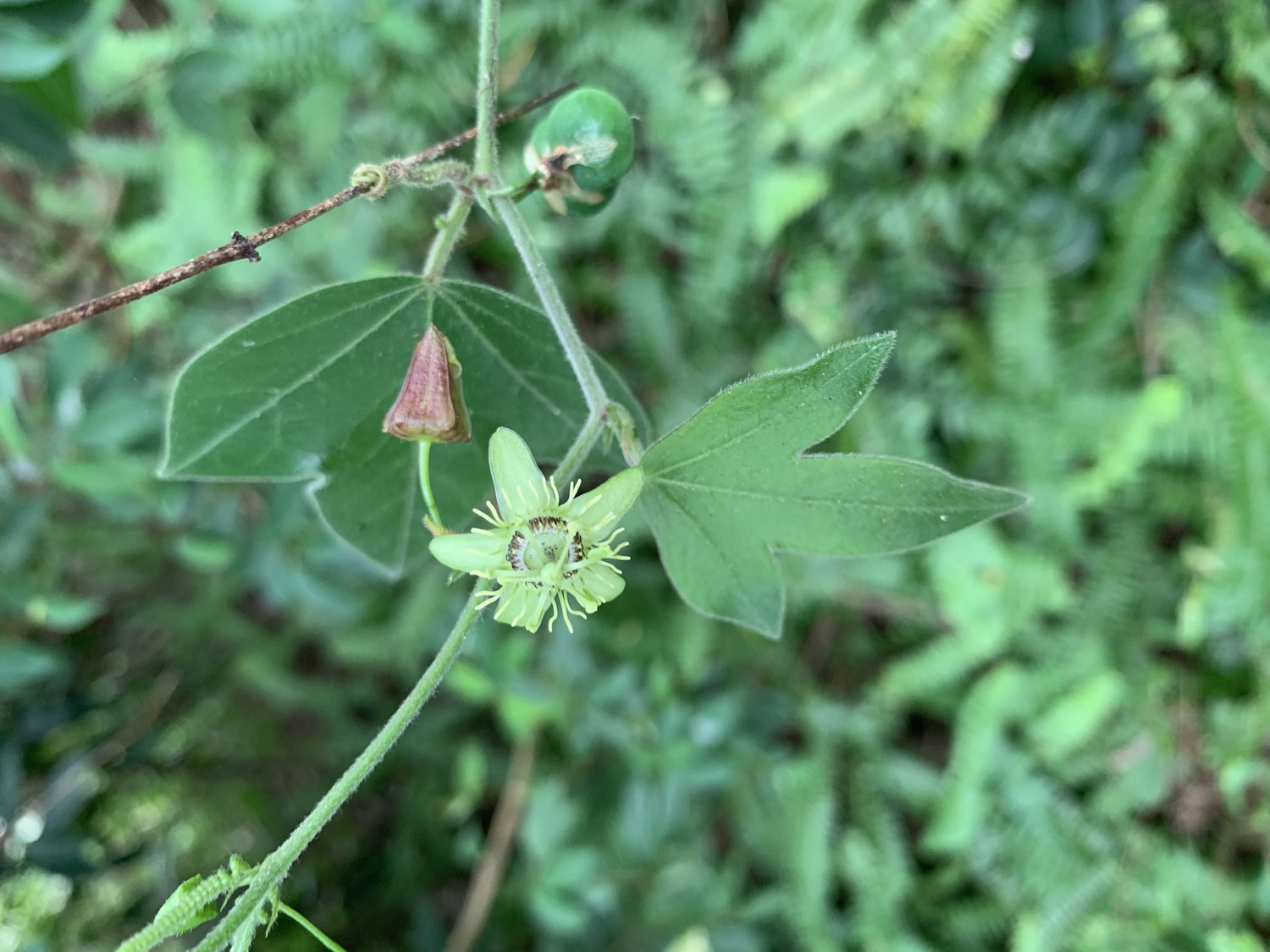 三角葉西番蓮, 西番蓮科(Passifloraceae), 西番蓮屬(Passiflora), 學名:Passiflora suberosa, 又稱為: 栓皮西番蓮、黑子仔、爬山藤、姬番果, 英文名稱:corkystem passion flower , 原產地: 巴西。