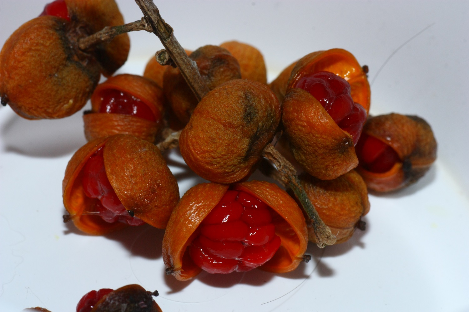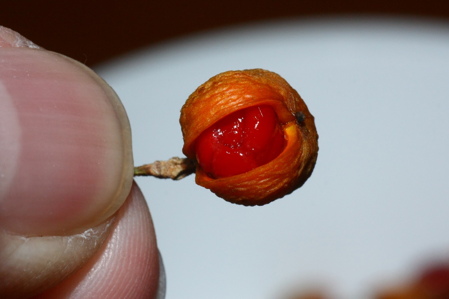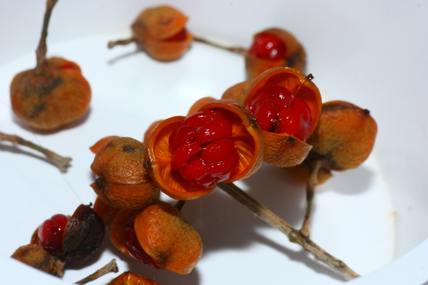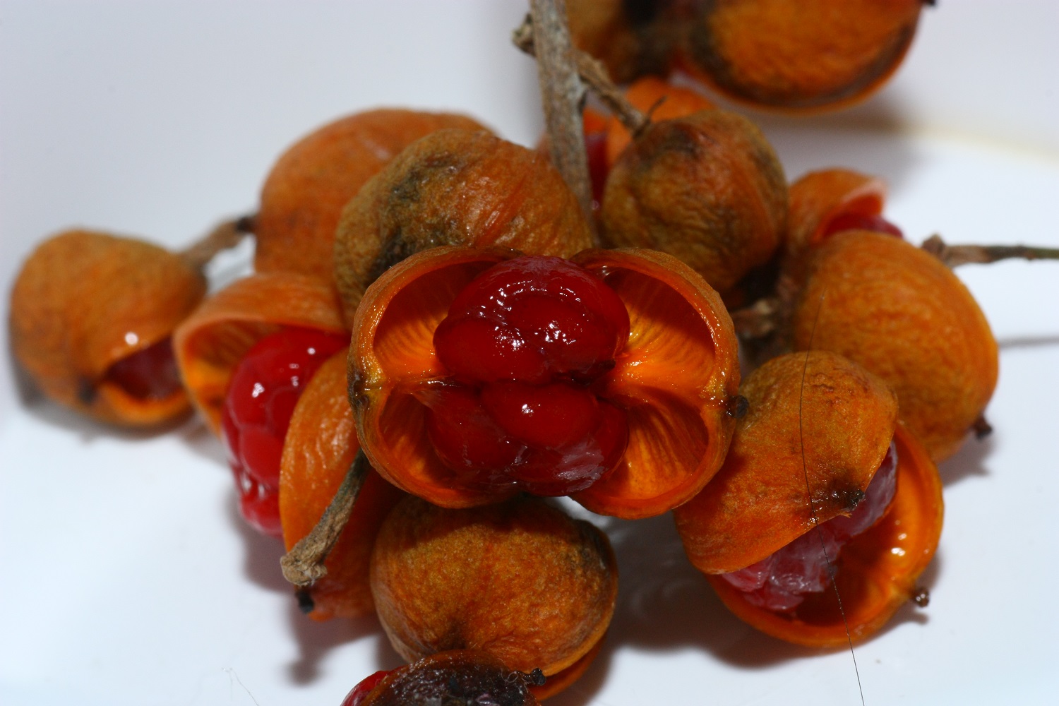 海桐, 學名: Pittosporum tobira (Thunb.) Ait,  海桐科(Pittosporaceae), 海桐屬(Pittosporum), 又稱為:七里香, 原產地: 東亞 , 夏秋開花, 花有香味, 結果期為秋冬, 果莢裂開後可以看見假種皮為紅色, 是小鳥喜歡吃的食物, 不過這紅色的果肉很黏很油, 不容易洗乾淨。