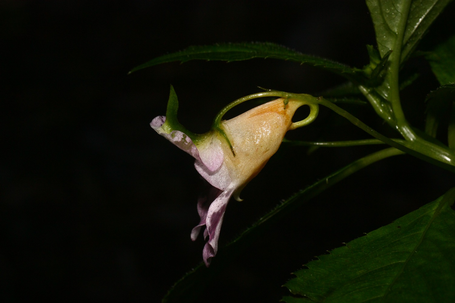 紫花鳳仙花的造形相當特殊, 後方有一個彎曲中空結構, 推測可能內含蜜汁, 要吸引特定長吻蛾類吸吮,以進行授粉。