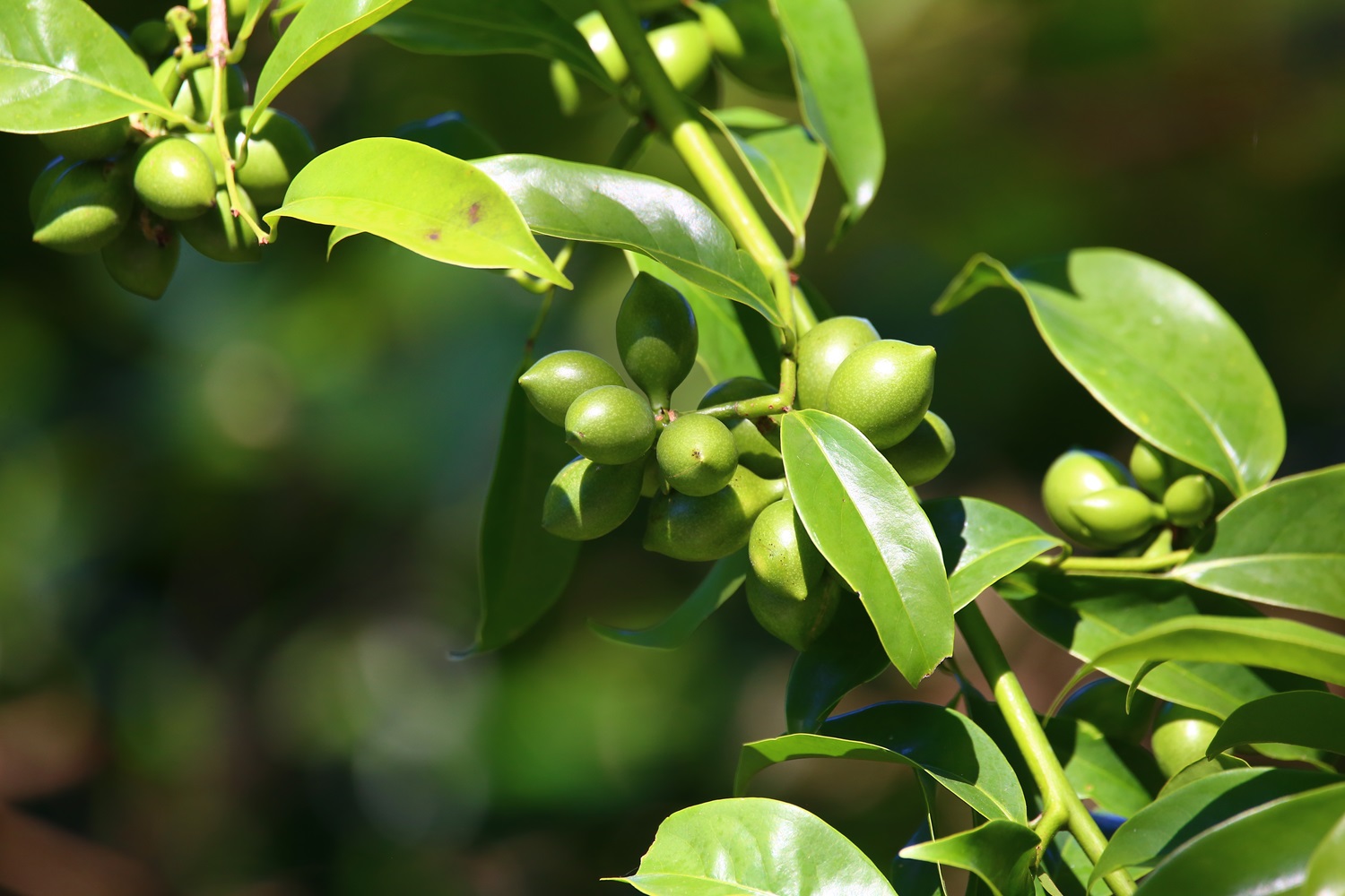 鷹爪花的果實成熟後變成黃色,聞起來有淡淡的水果香味,類似熟芭樂,當摘取其中一顆時,旁邊的果實瞬間自行脫落,掉一地。