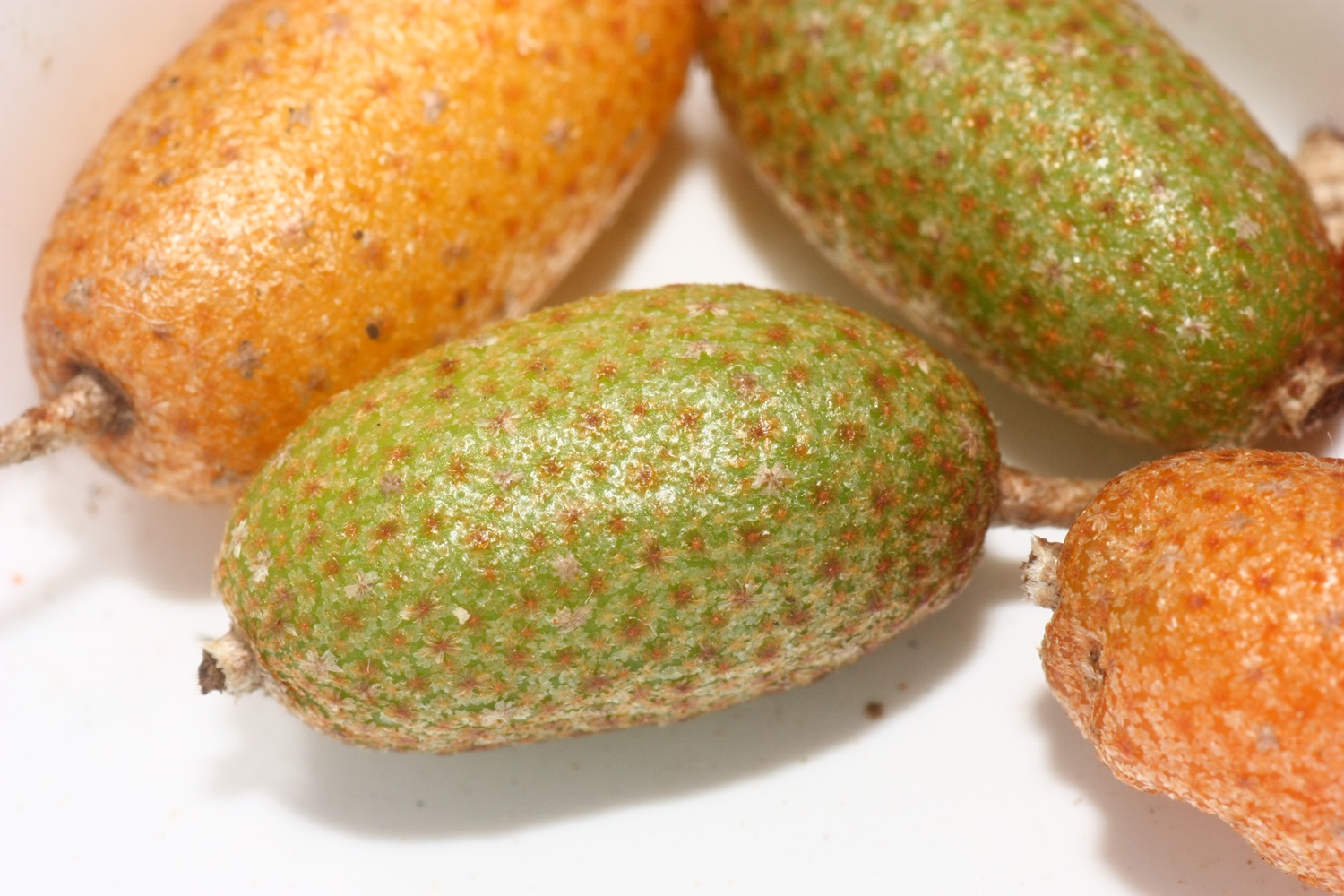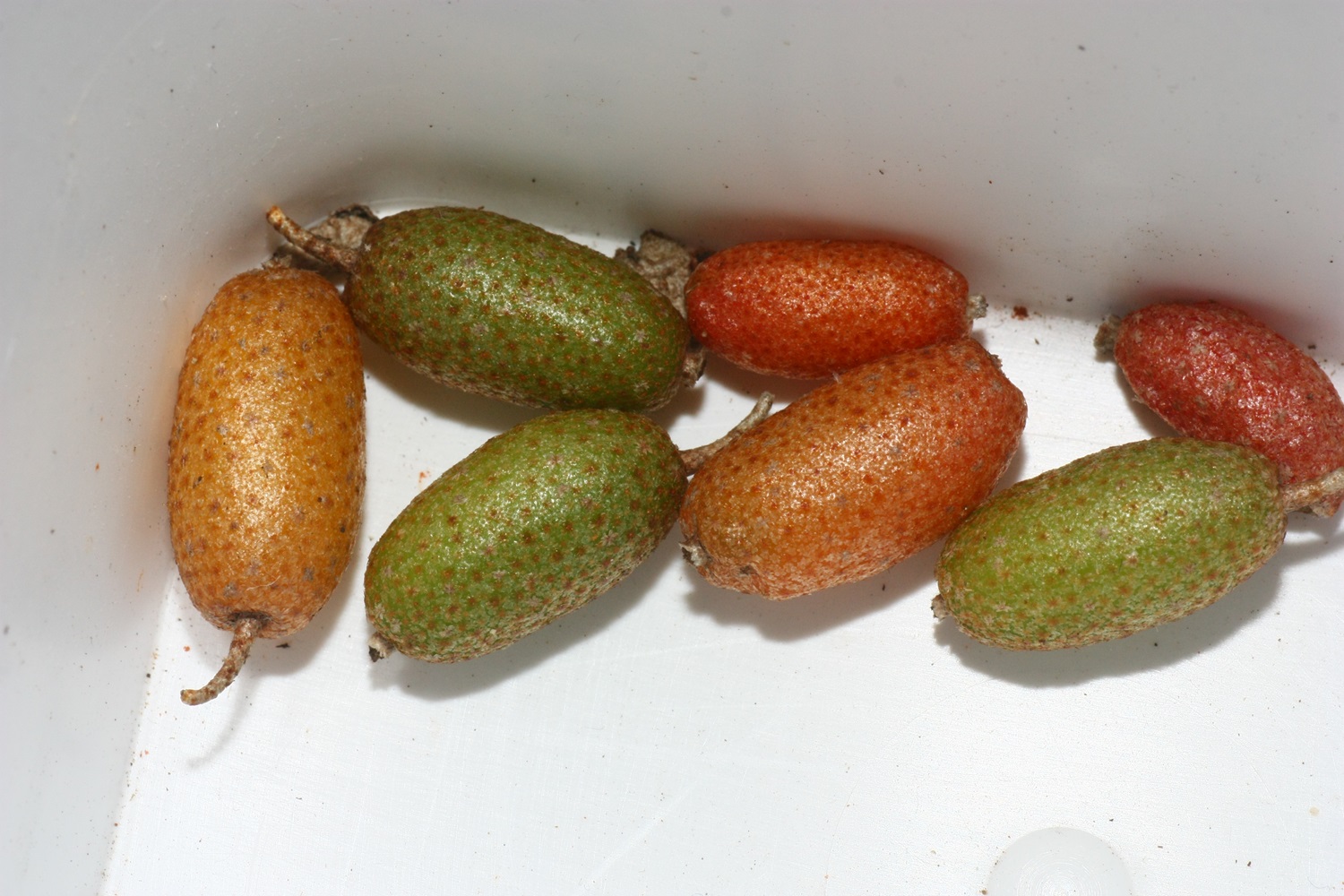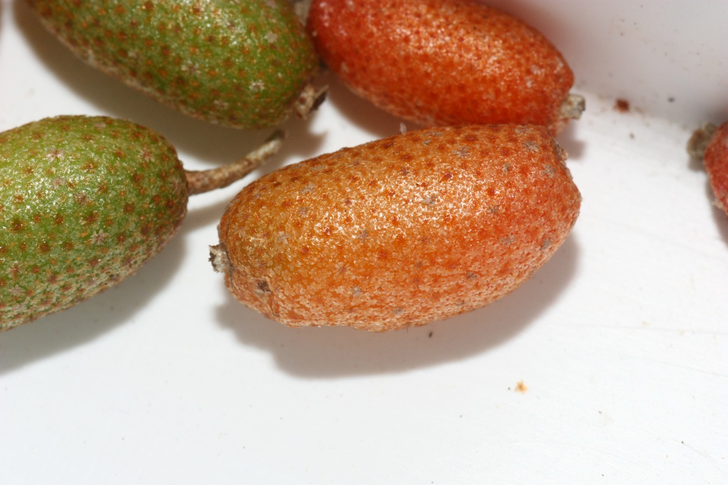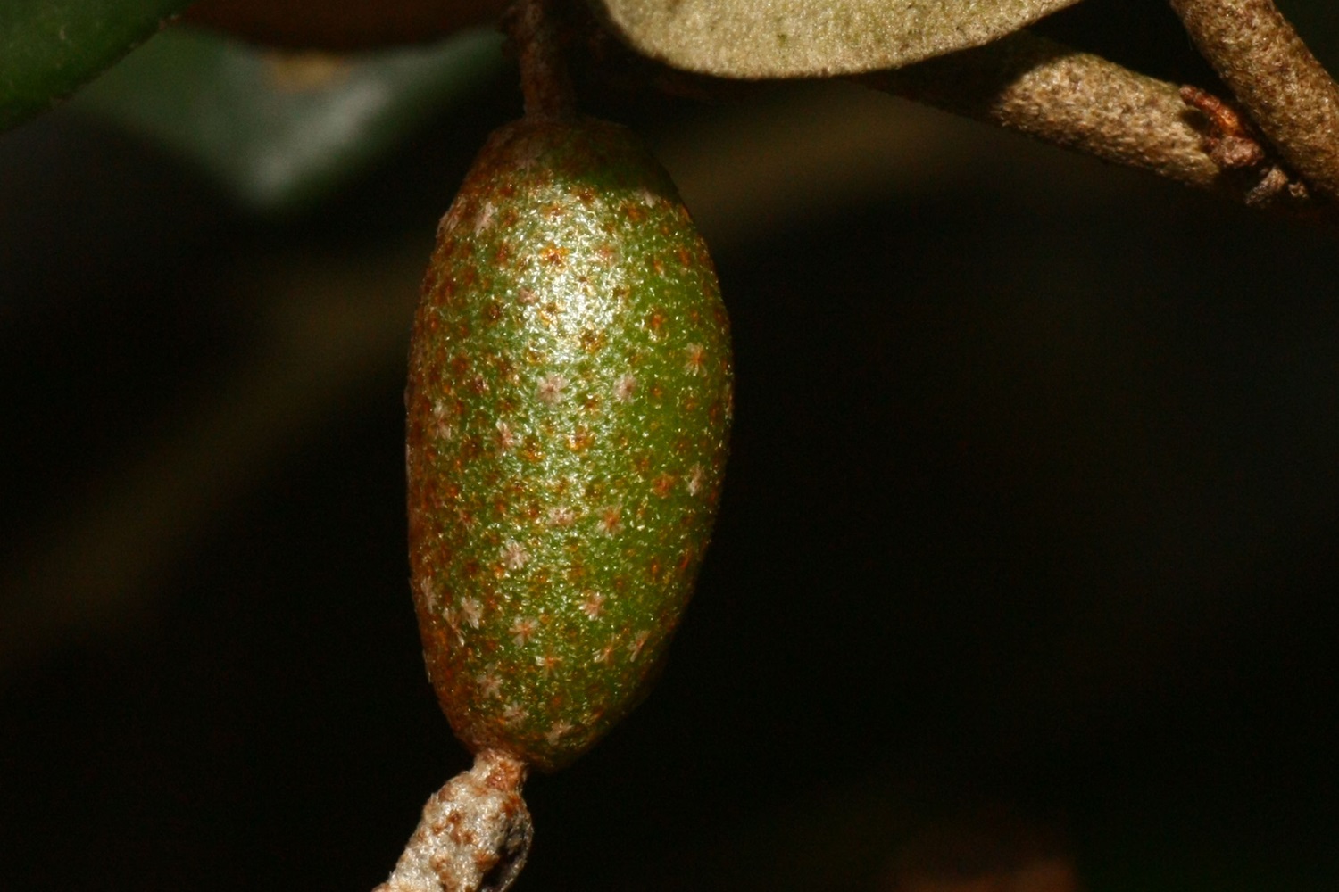 台灣胡頹子的果實長橢圓形,表面的鱗片白中帶褐色,與椬梧不同,