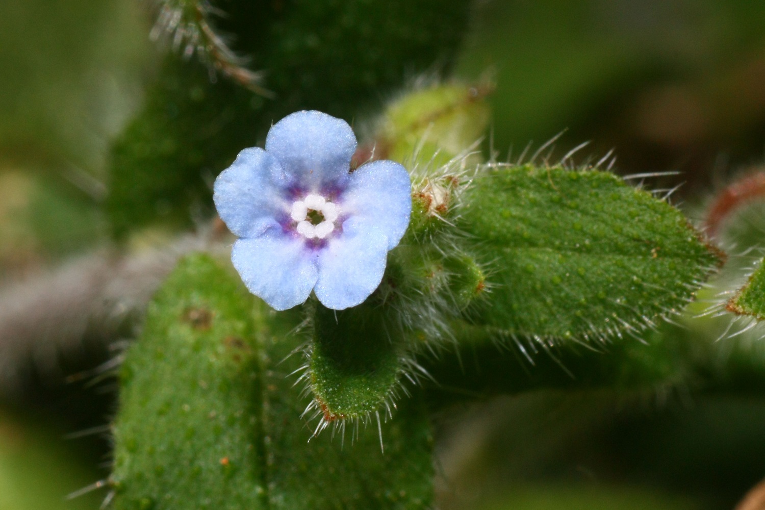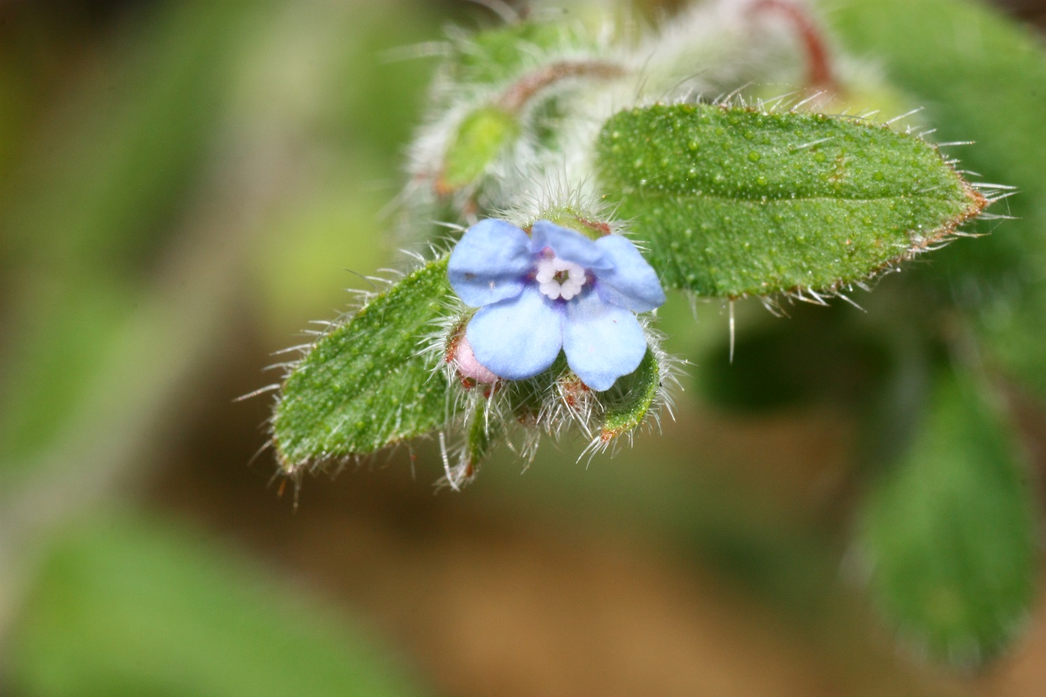 全株披柔毛, 花藍色, 靠近中心有5個白色突起, 花瓣5片, 花期2~5月, 果期3~6月