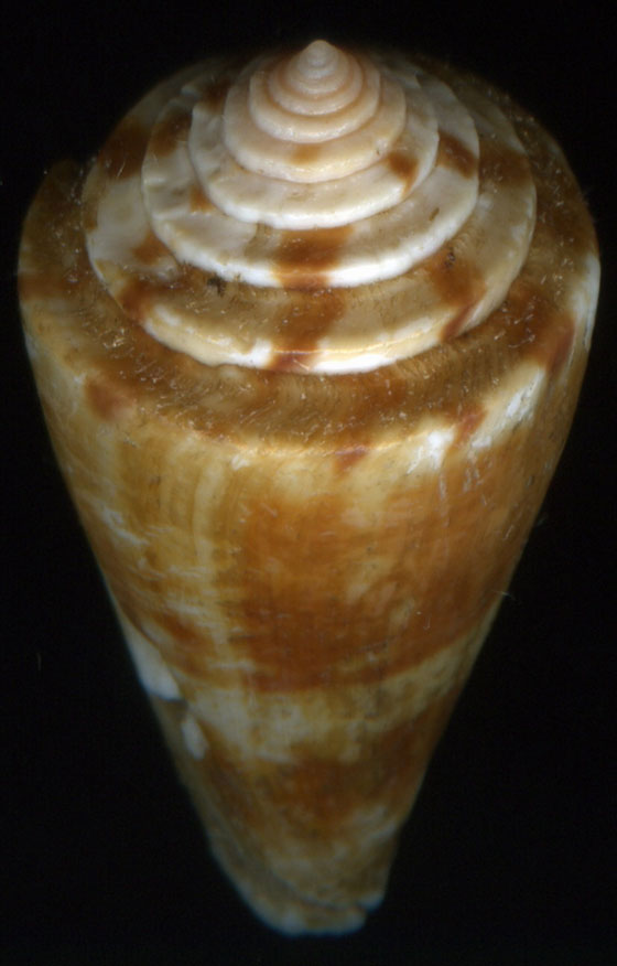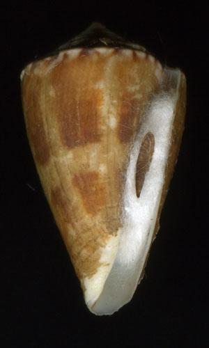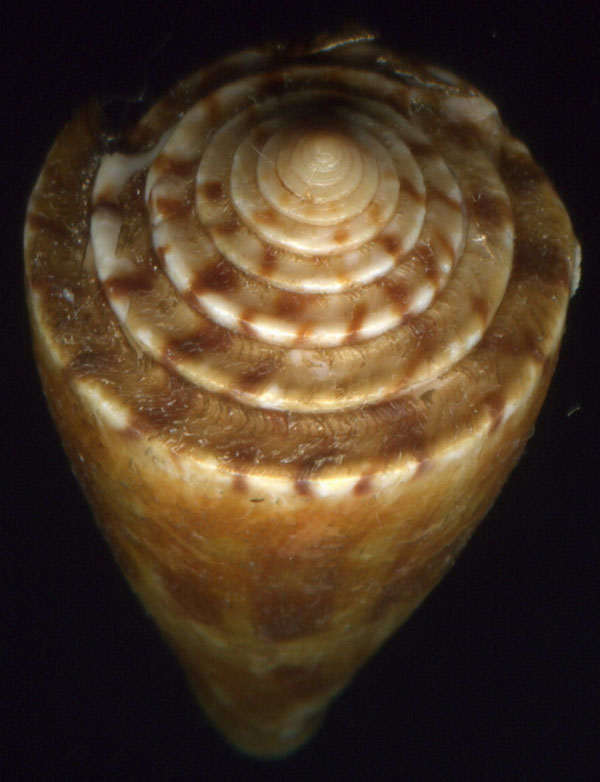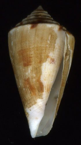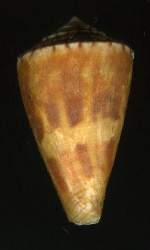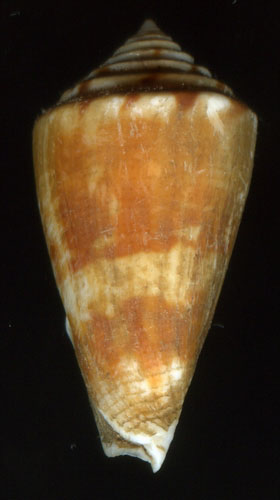 一為芋螺專書P431所示:殼肩略寬.體層遍佈細點.中段有二條花紋帶.螺塔縫合明顯或不明顯.螺塔不內縮並有斑點