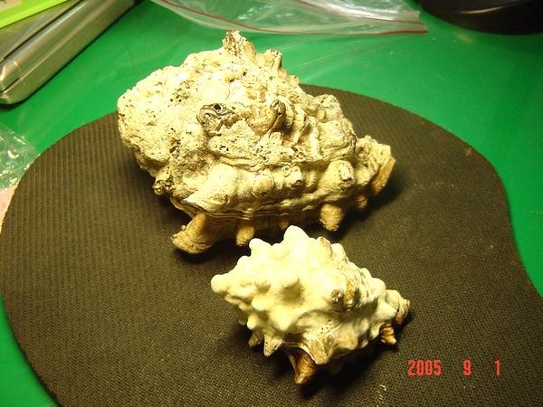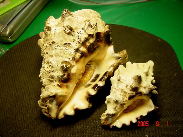 短拳螺, 104.6mm, F/F+, 殼表很多蛀孔, 台灣北部海域產.NT$ 3650. (小的68mm,供比較,不出售。)