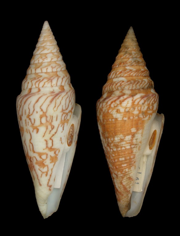 左邊是中安型的花紋;右邊與pulcherrimus的花紋相同,不論是中安還是pulcherrimus都是Conus excelsus的異名喔。他們的口蓋保證是原來的,與我之前發表的菲律賓標本不太一樣是因為這兩枚的口蓋都受傷過,這也就是前文有一枚寺町芋螺的口蓋沒鋸齒狀我說未必不是原口蓋的原因。