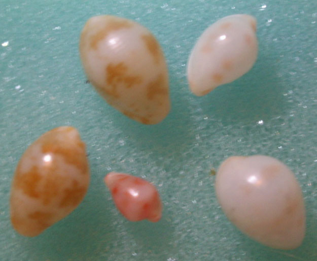 品相不錯, 尤其是下方那顆Primovula roseomaculatae更是豔麗, 是星期天(10/30)去撿的嗎? 我星期六去剛好遇到漲潮, 而且天候亦不佳, 沒撿多久就打道回府了, 不過以收穫/時間比而言, 成果還是很不錯的.