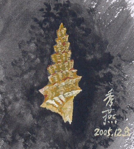 「秀燕」是我的同事,具美術專長,某日和她聊到貝殼,一時興起叫她畫幾張來看看,她隨口答應.於是馬上拿幾種固定帶在身邊欣賞的殼給她,其中有兩顆不到1cm 的迷你貝,真是難為她了.幾天後她就交出做作品,問她迷你貝是否有使用放大鏡,她說沒有,直接拿在手上畫的,感激之餘,回送她一顆玫瑰泡螺和一顆豔捻螺.藝術無價而貝殼有價,再怎樣還是我賺,哈哈...
