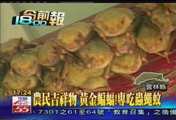 雲林縣水林鄉最近來了一群黃金蝙蝠,這群蝙蝠不是黑的,全身金黃蝙蝠棲息在當地一個古厝的屋樑上,傍晚就會飛出去覓食,它們專吃田裡害蟲,當地農民都把它們當成吉祥象徵,希望黃金蝙蝠能招來金銀財寶和福氣。