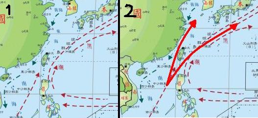 我在地圖上只找到一條黑潮(1),那我畫的(2)正確嗎? 黑潮是一條向上住日本一條向台灣嗎?還是2條一起向上or向下呢?