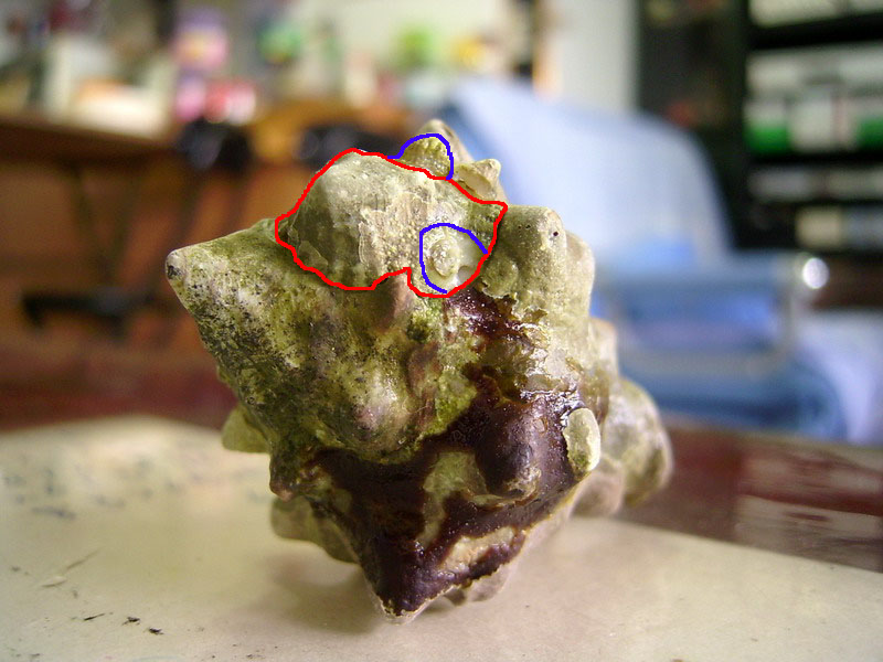 2.下面藍色圈處原本有另一隻貝殼(而且是公的), 現在掉下來, 留下一個凹痕