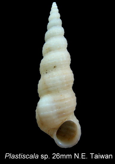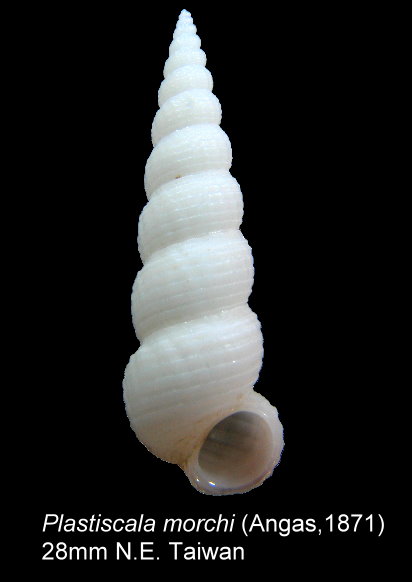 但是這兩個form長得如何?Review有附Kaicher1981的著作可查.但Kaicher著作?在哪裡?我就不知道了.手頭上的資料Plastiscala屬內的物種類似左殼的就只有morchii.先用偷吃步:將兩殼直放由殼底看殼口與螺體的夾角,如果一致,form的可能性大增.真的要確定,就要找Kaicher1981的著作.