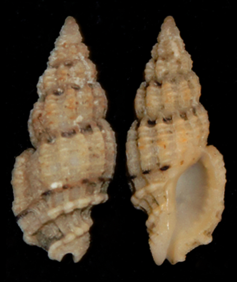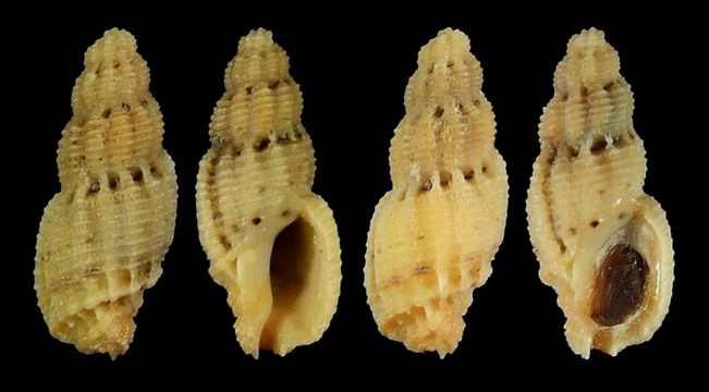 這種螺在《臺灣貝類資料庫》中的名稱叫「彫孔螺」。剛領到的36期《貝友》113頁則叫「網目結螺」。兩個月前曾收到一個活體的,只有15.8mm,如下圖,左活體,右清洗後。