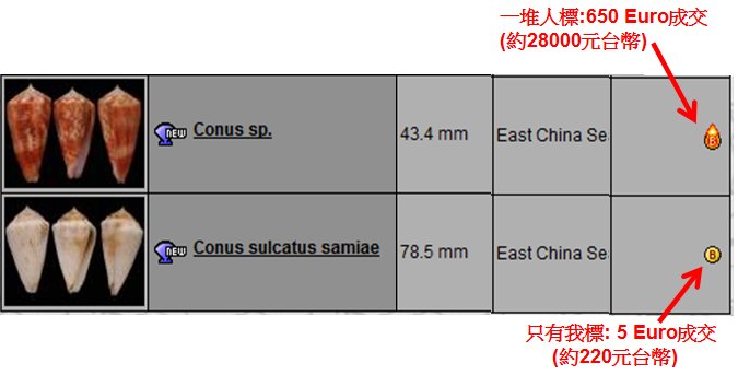 這隻43.4mm芋螺是最近094次義大利網拍,統計前五十項最有趣殼的榜首,18元起標,9位貝友下了17次標才結標.