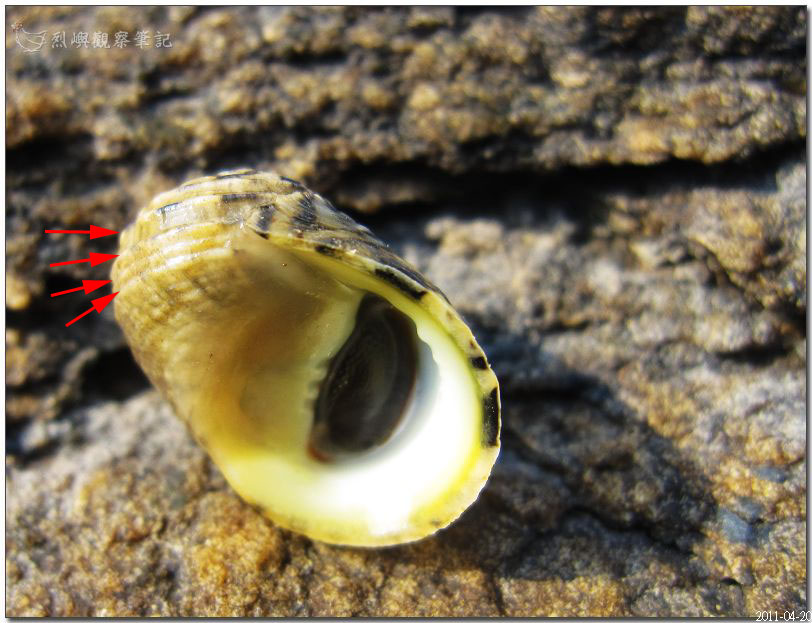 齒紋蜑螺:顧名思義,他有內唇"齒"也有螺旋"紋"(有的只在早期螺層顯現)