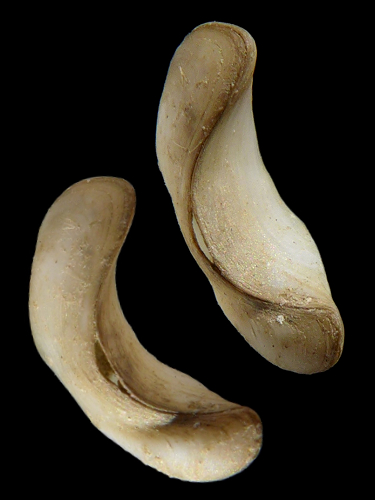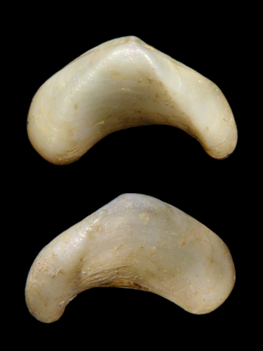 一堆龜山島海底沉積物,撿幾顆不到3公分的赤蛙螺殼,稍搖晃,掉出小貝一枚。乍看是畸形的雙殼貝,長相頗有特色。