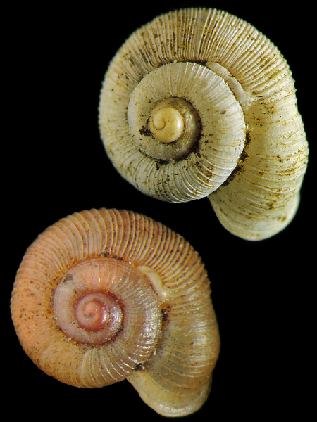 台灣扁帶管蝸的殼胚呈黃色調,除此之外兩者紋理相似: