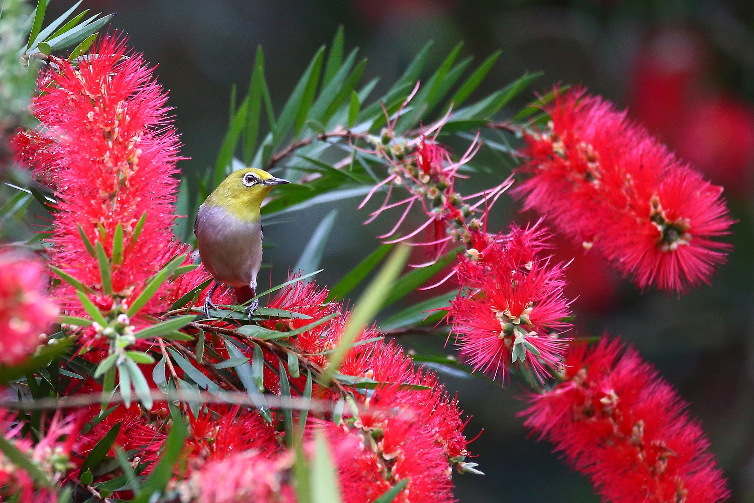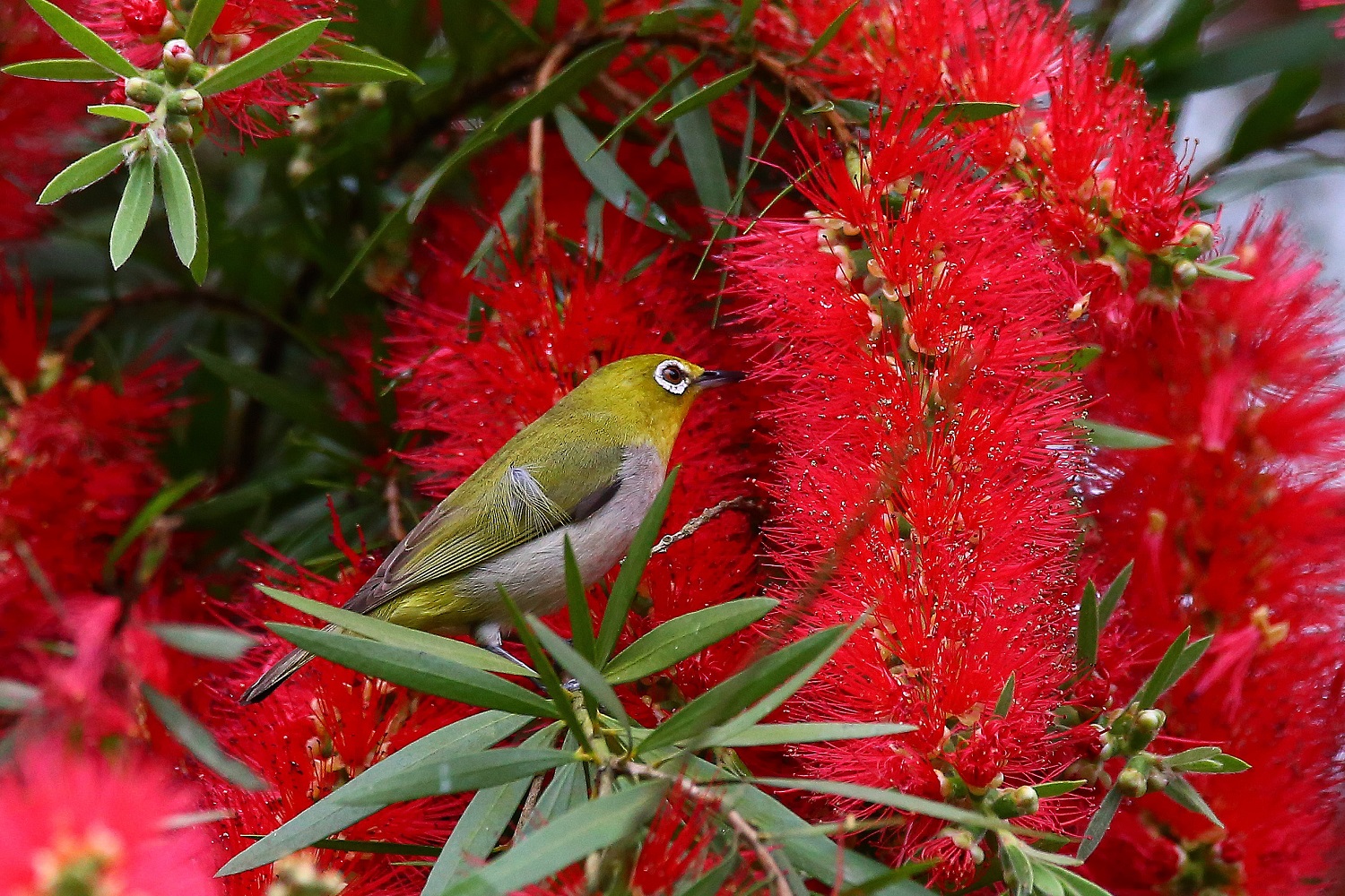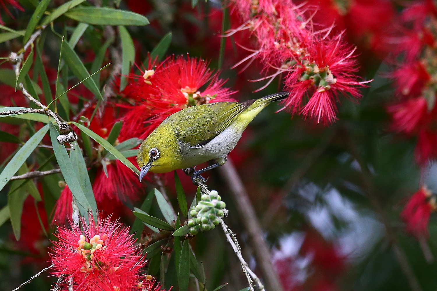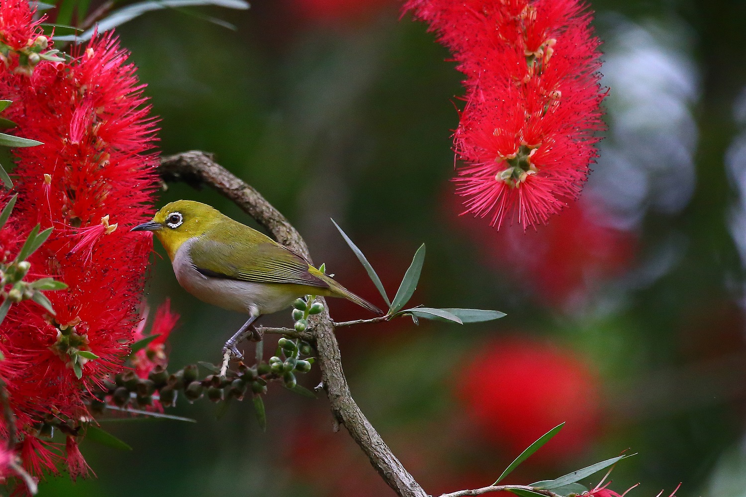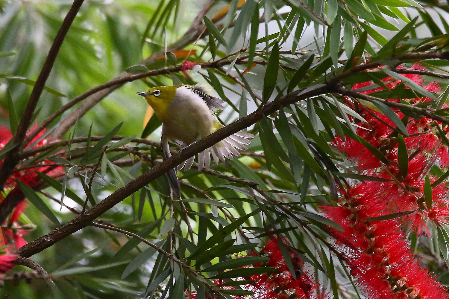 紅瓶刷子樹的位置距離火炬刺桐不遠, 花期也接近, 因此, 2月拍山櫻花與綠繡眼, 3月拍火炬刺桐與綠繡眼, 4月可以接著拍紅瓶刷子樹與綠繡眼