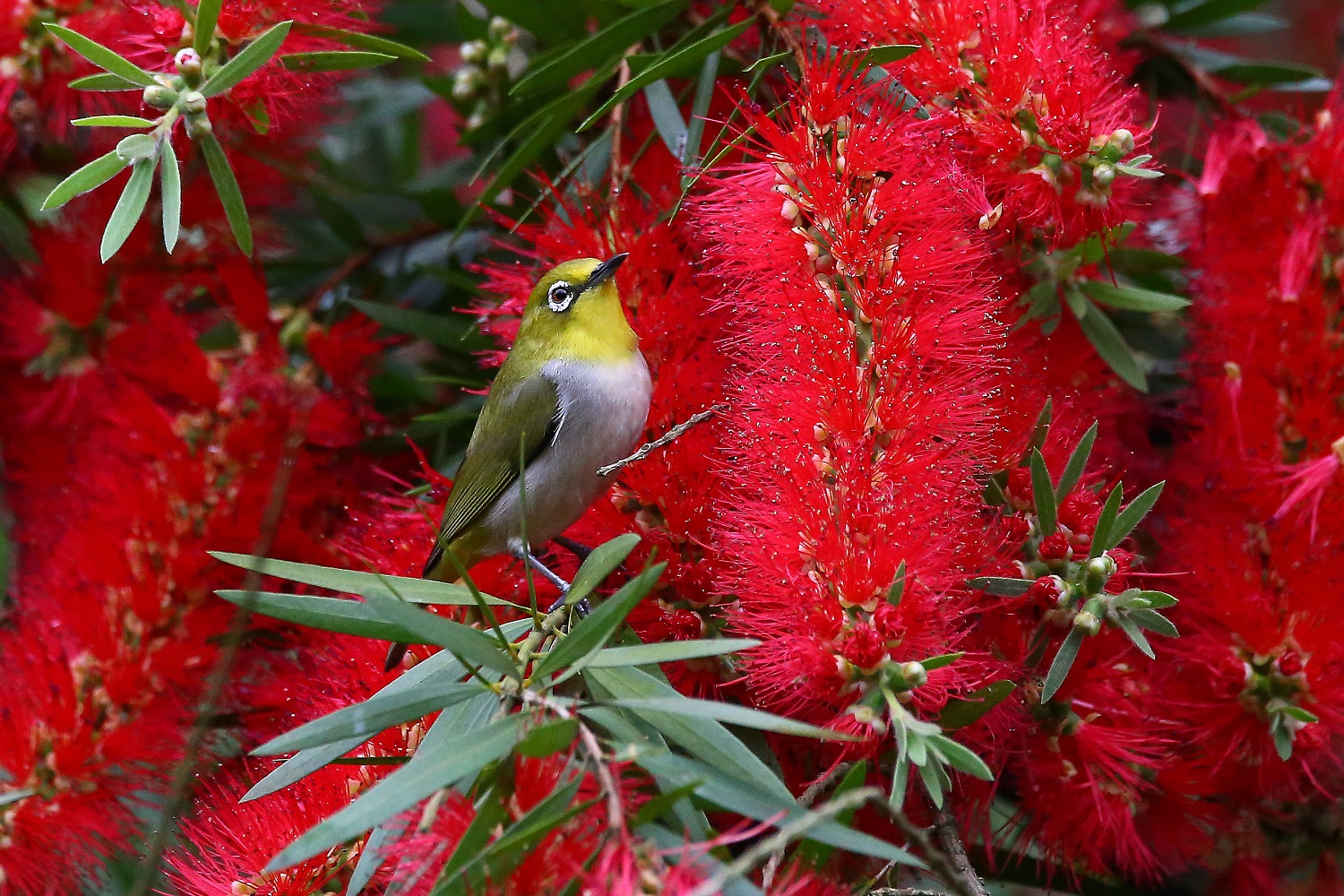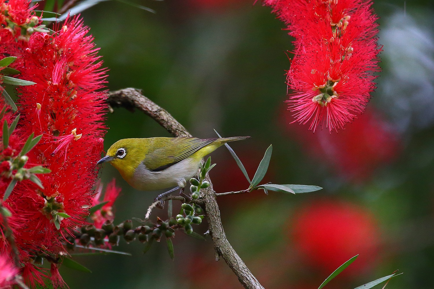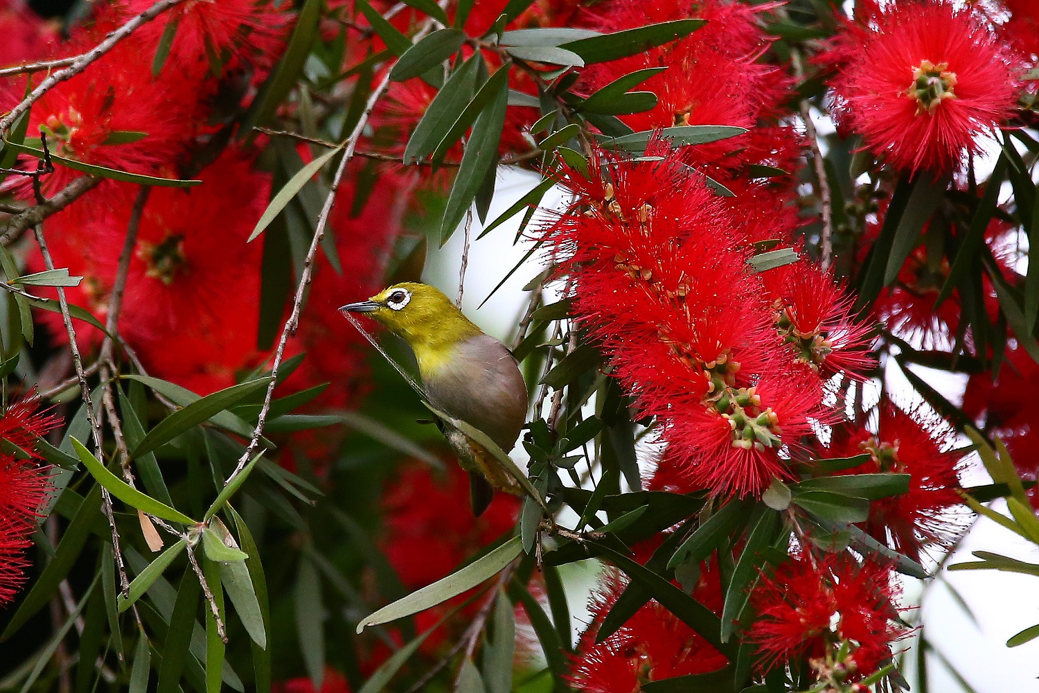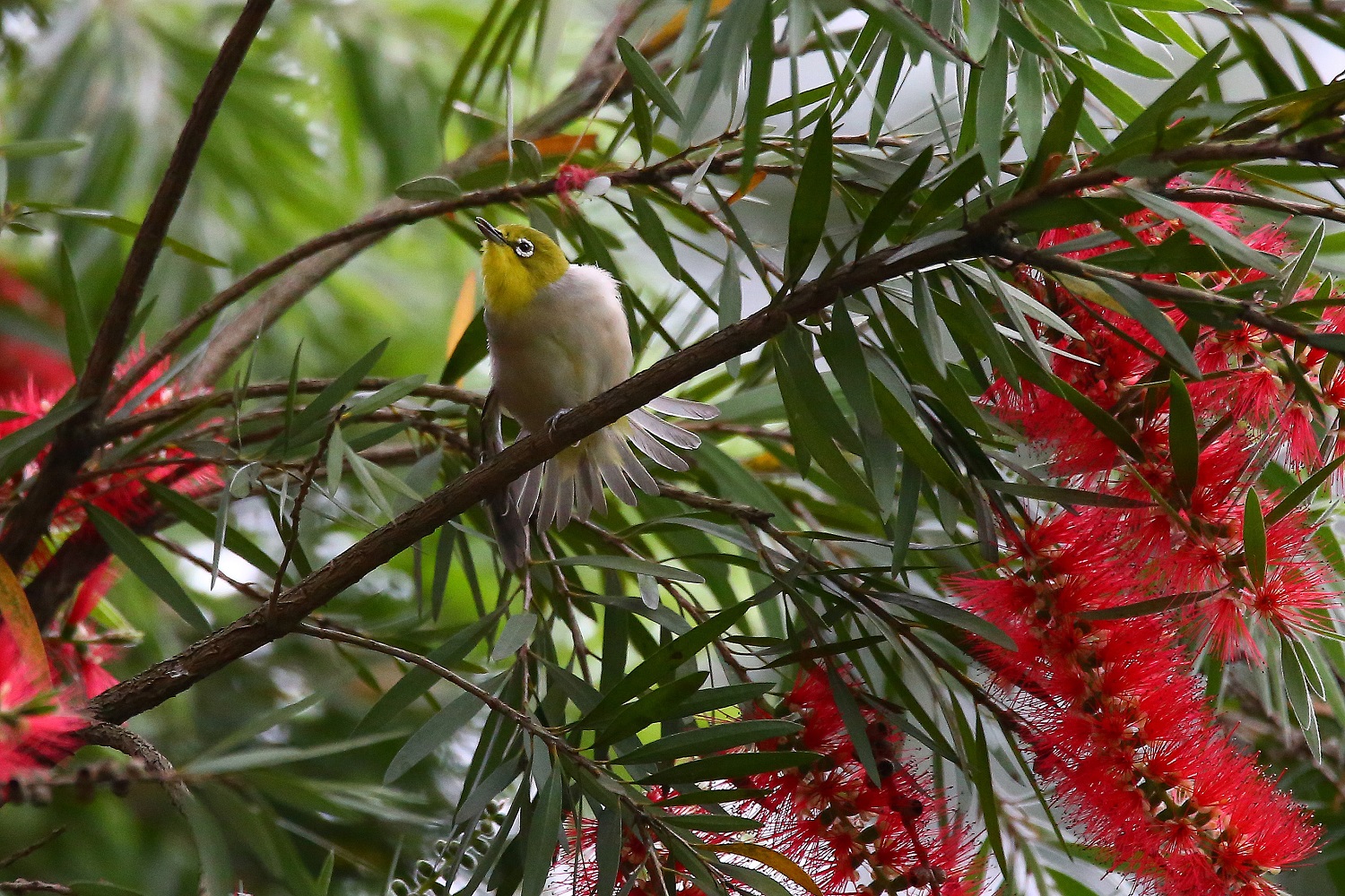 紅瓶刷子樹的位置距離火炬刺桐不遠, 花期也接近, 因此, 2月拍山櫻花與綠繡眼, 3月拍火炬刺桐與綠繡眼, 4月可以接著拍紅瓶刷子樹與綠繡眼