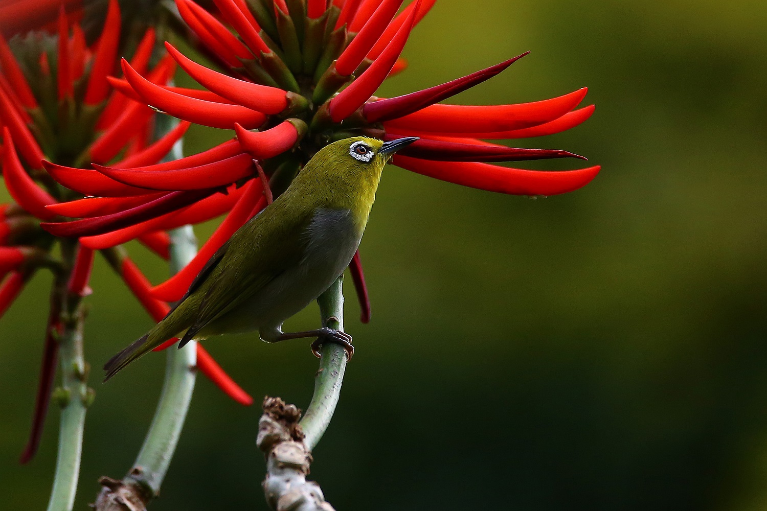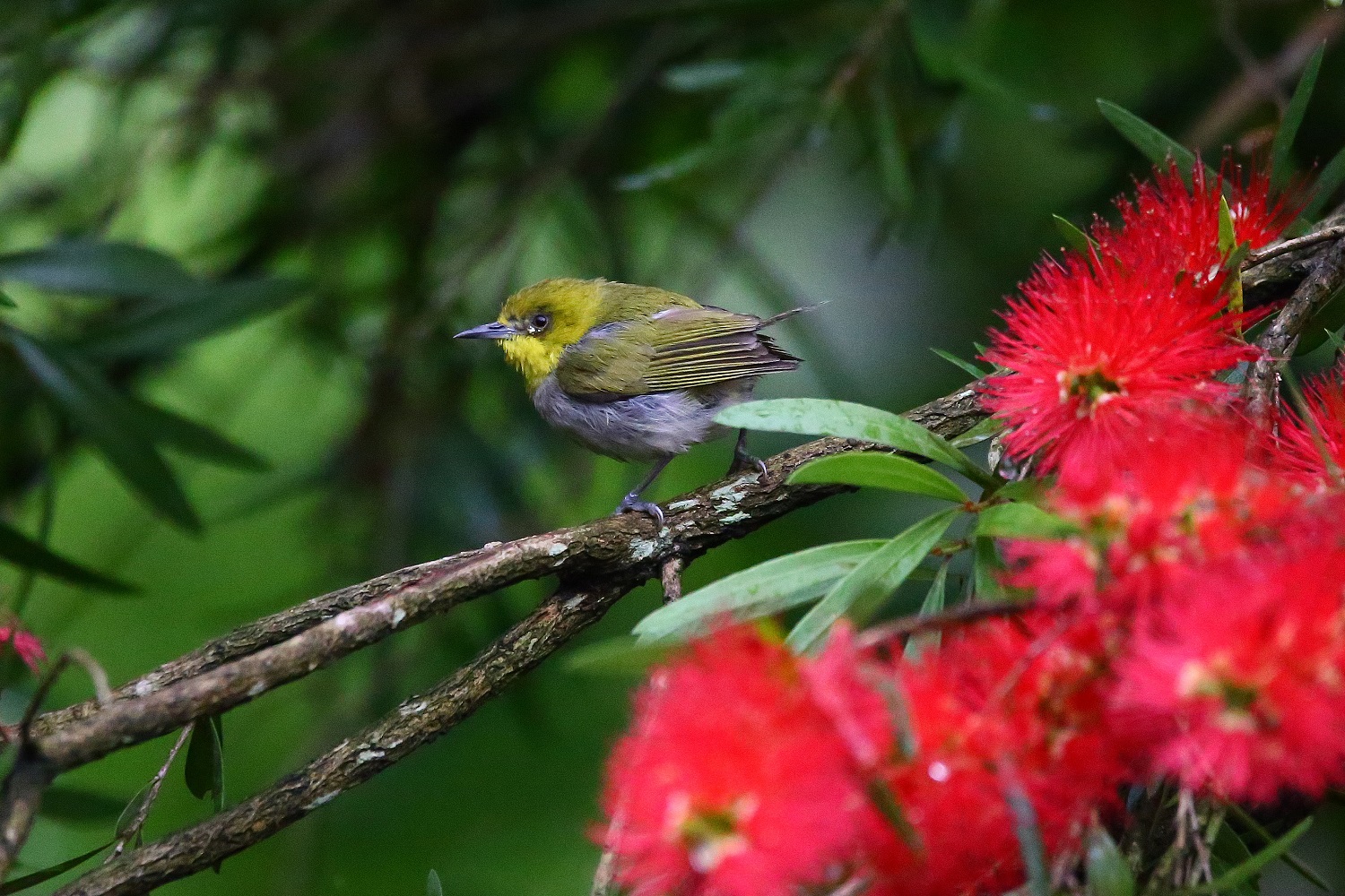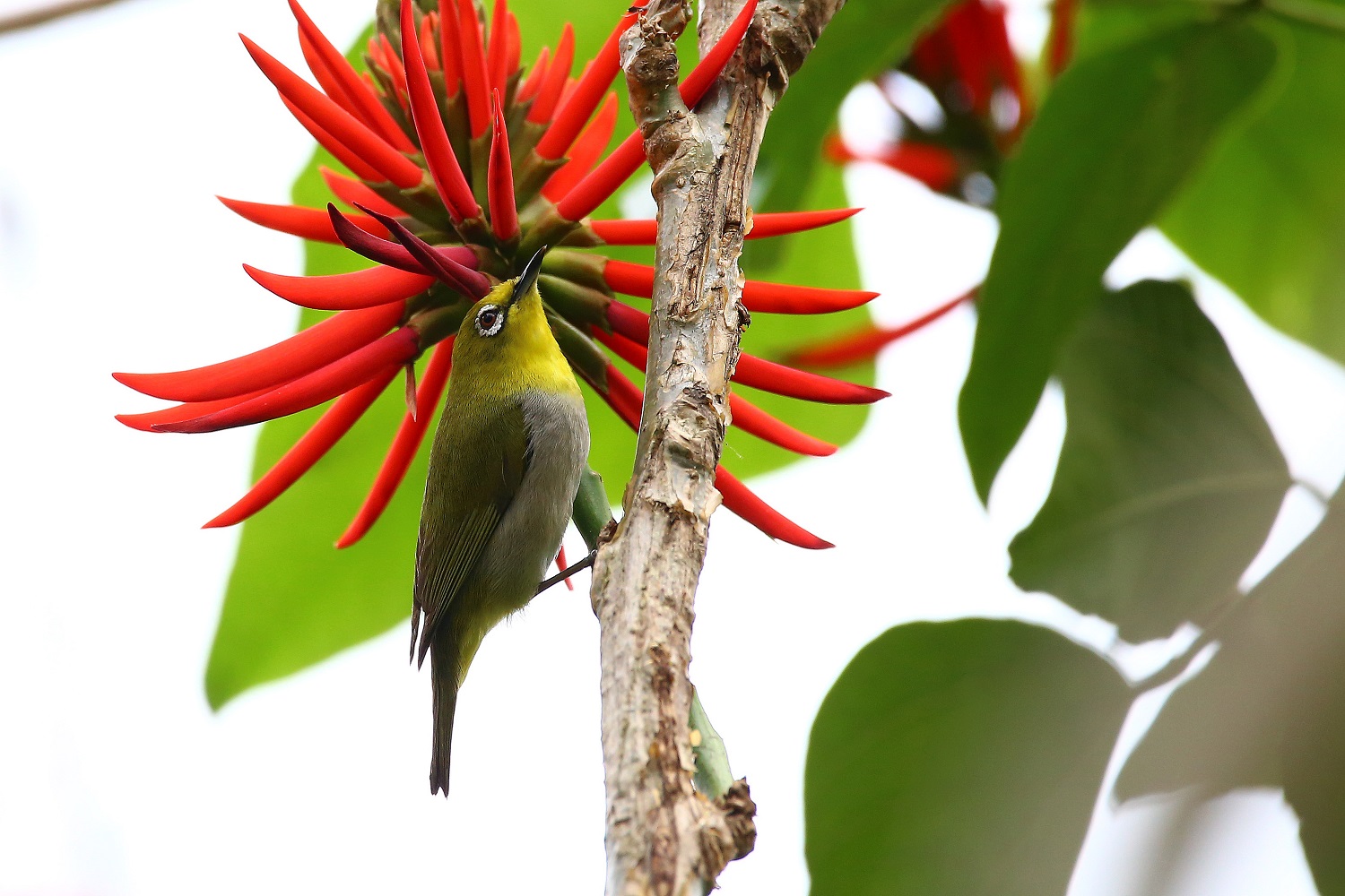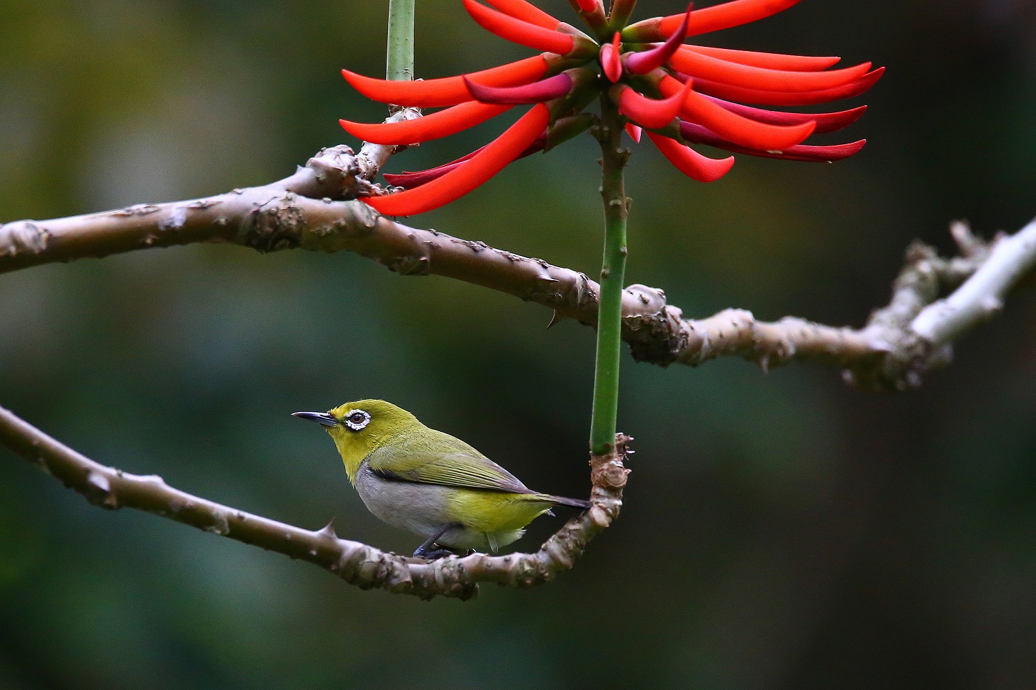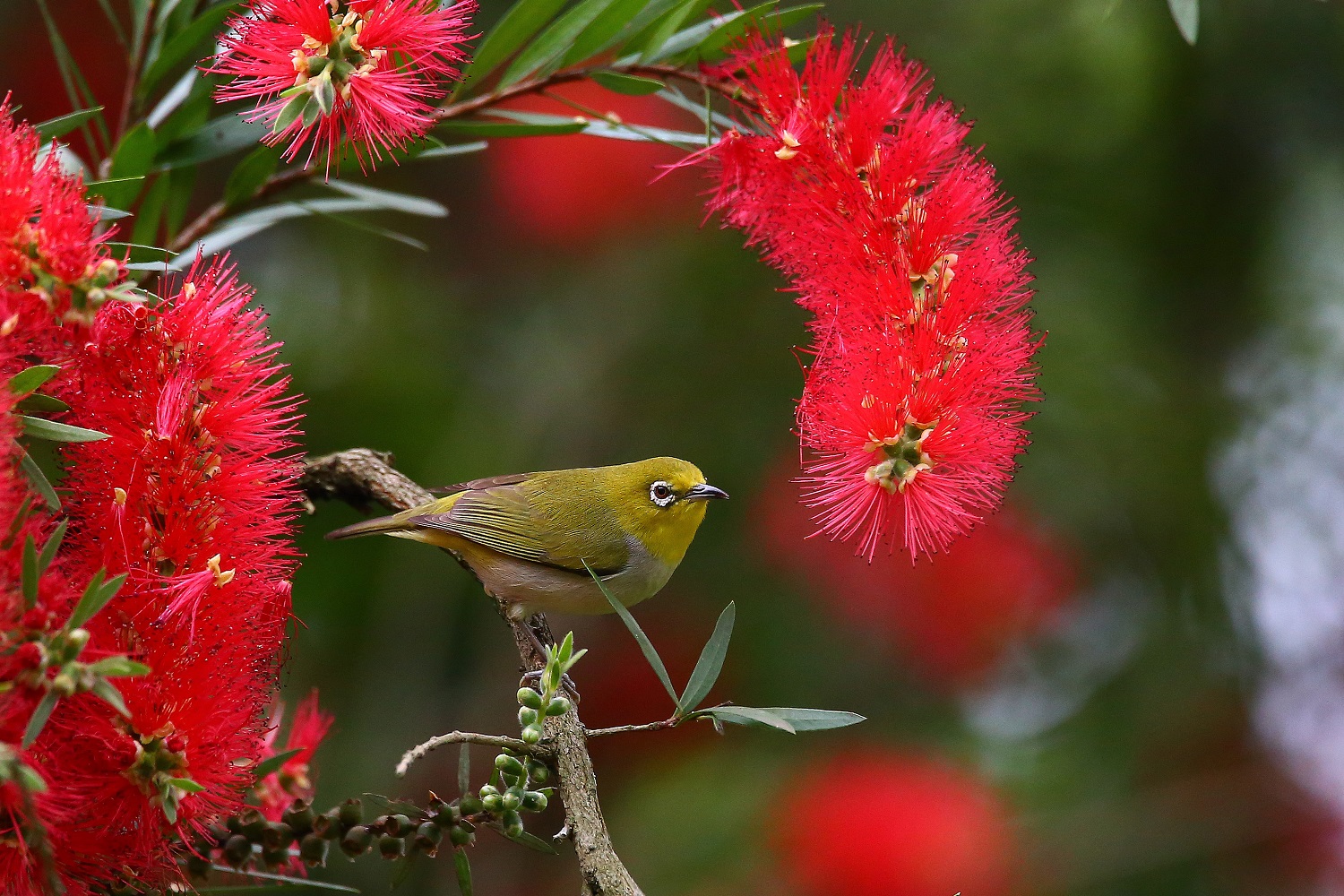 紅瓶刷子樹的位置距離火炬刺桐不遠, 花期也接近, 因此, 2月拍山櫻花與綠繡眼, 3月拍火炬刺桐與綠繡眼, 4月可以接著拍紅瓶刷子樹與綠繡眼